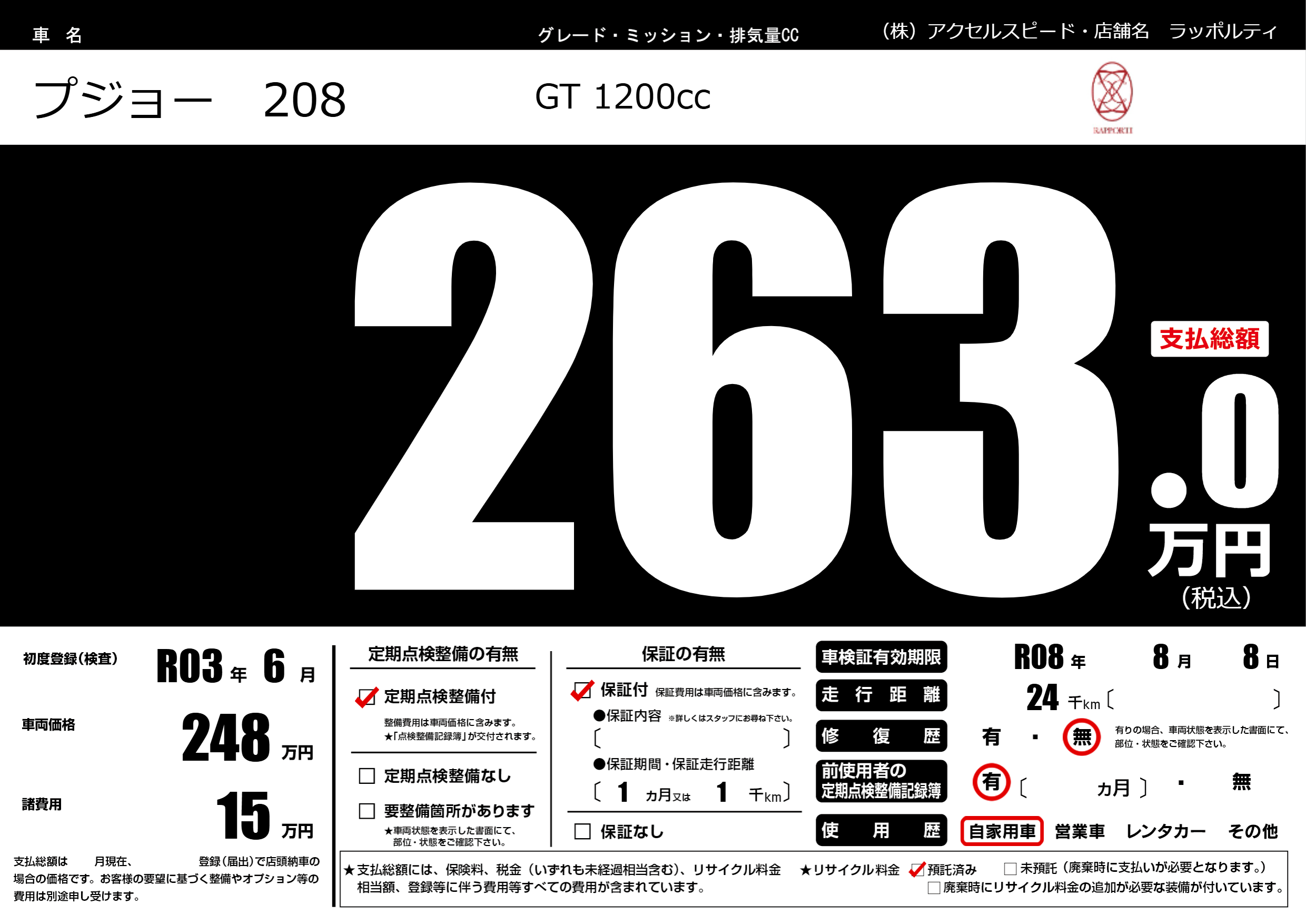 | 車名 | プジョー 208 | グレード ミッション 排気量 |