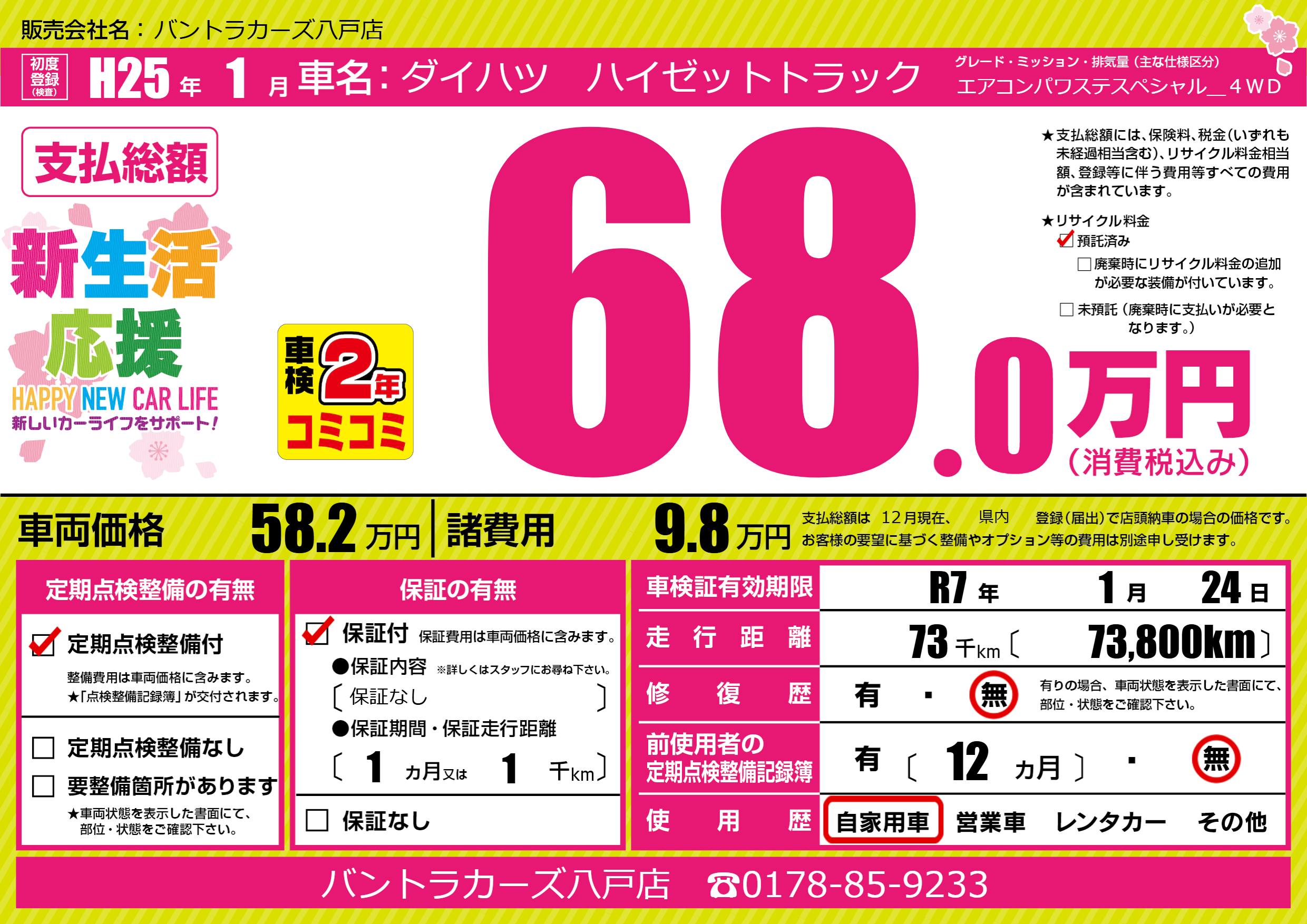 | 走行キロ | 7.3万km | 初年度登録 | H25年1月 |