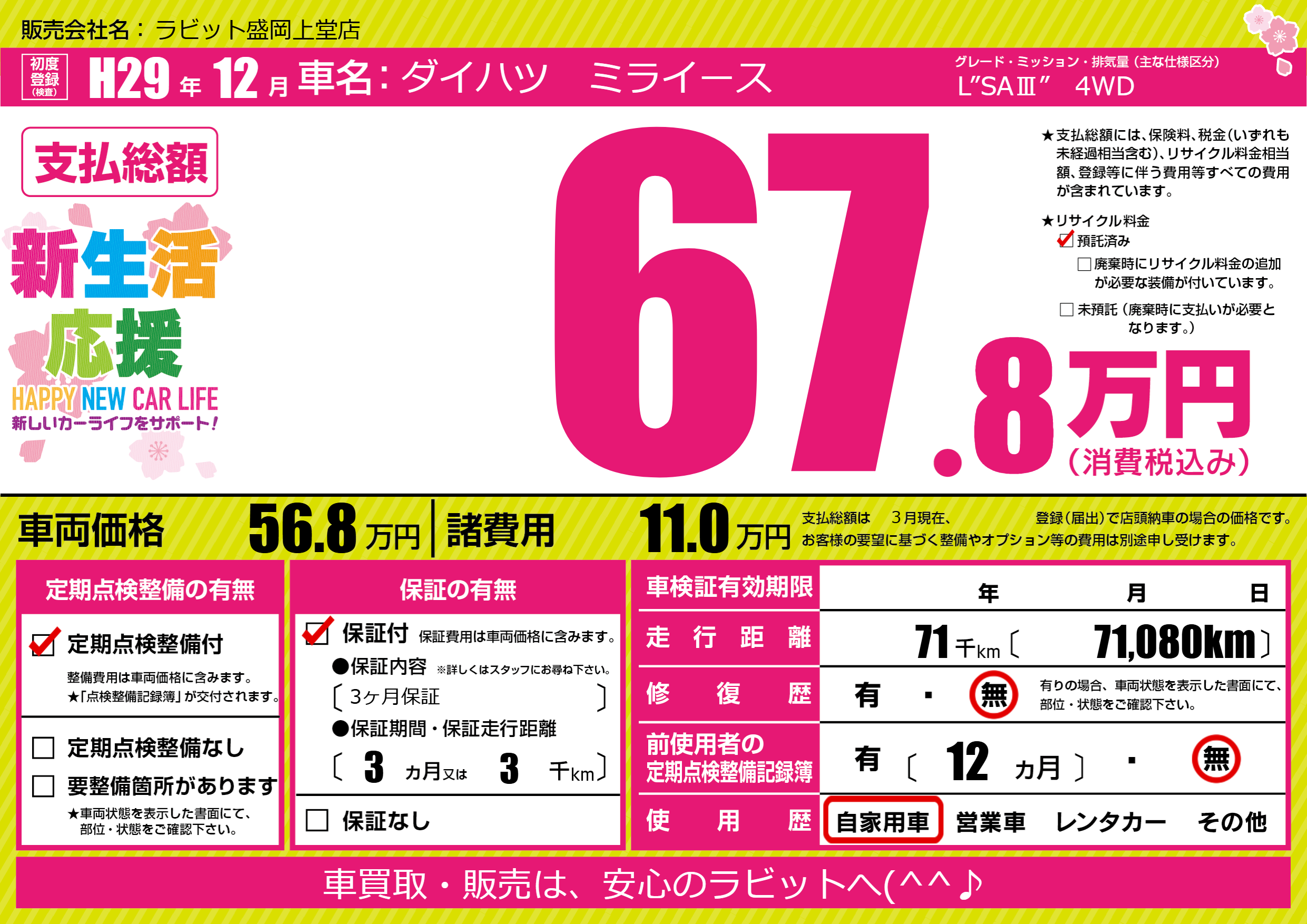 | 車名 | ダイハツ ミライース | グレード ミッション 排気量 |