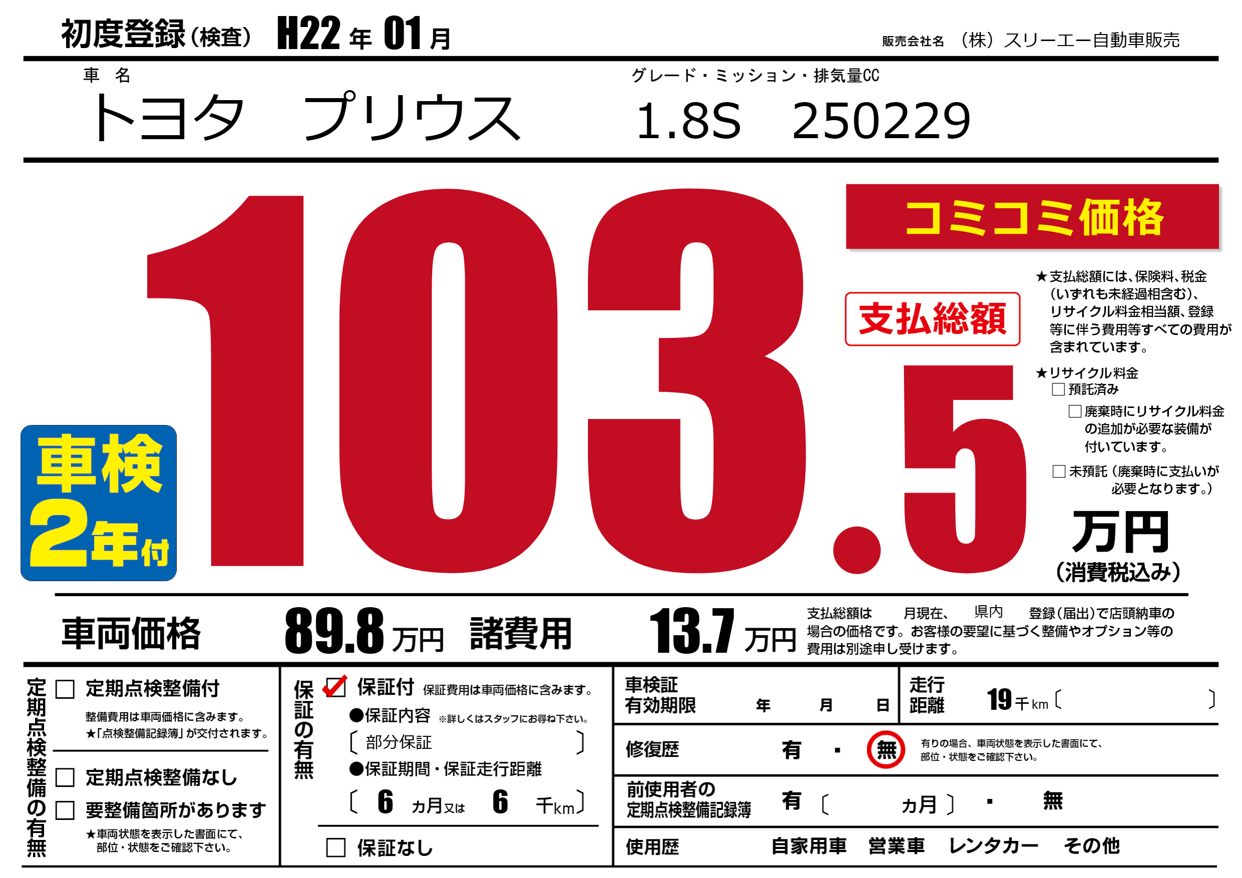 | 車名 | トヨタ プリウス | グレード ミッション 排気量 |