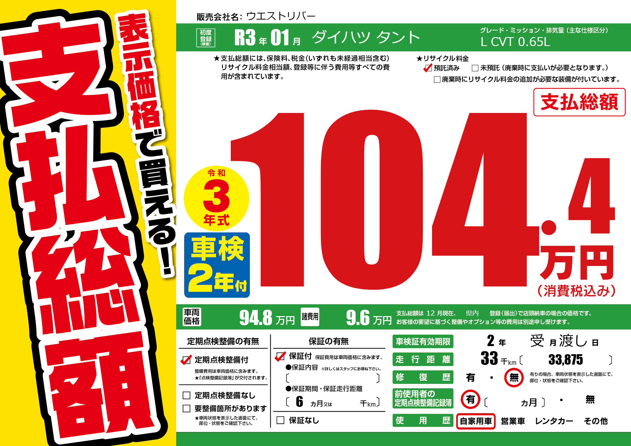 | 車名 | ダイハツ タント | グレード ミッション 排気量 |