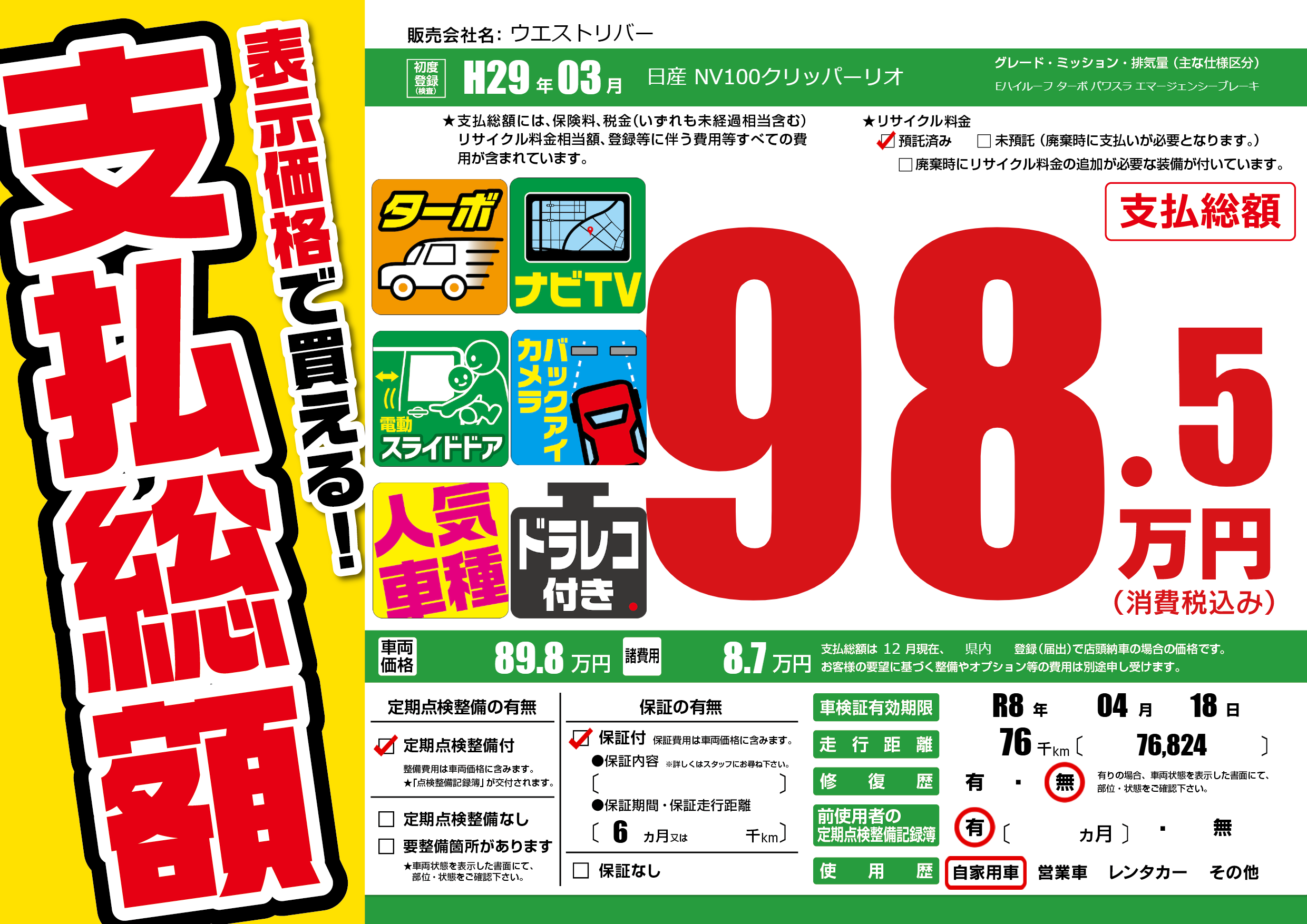 | 走行キロ | 7.6万km | 初年度登録 | H29年03月 |