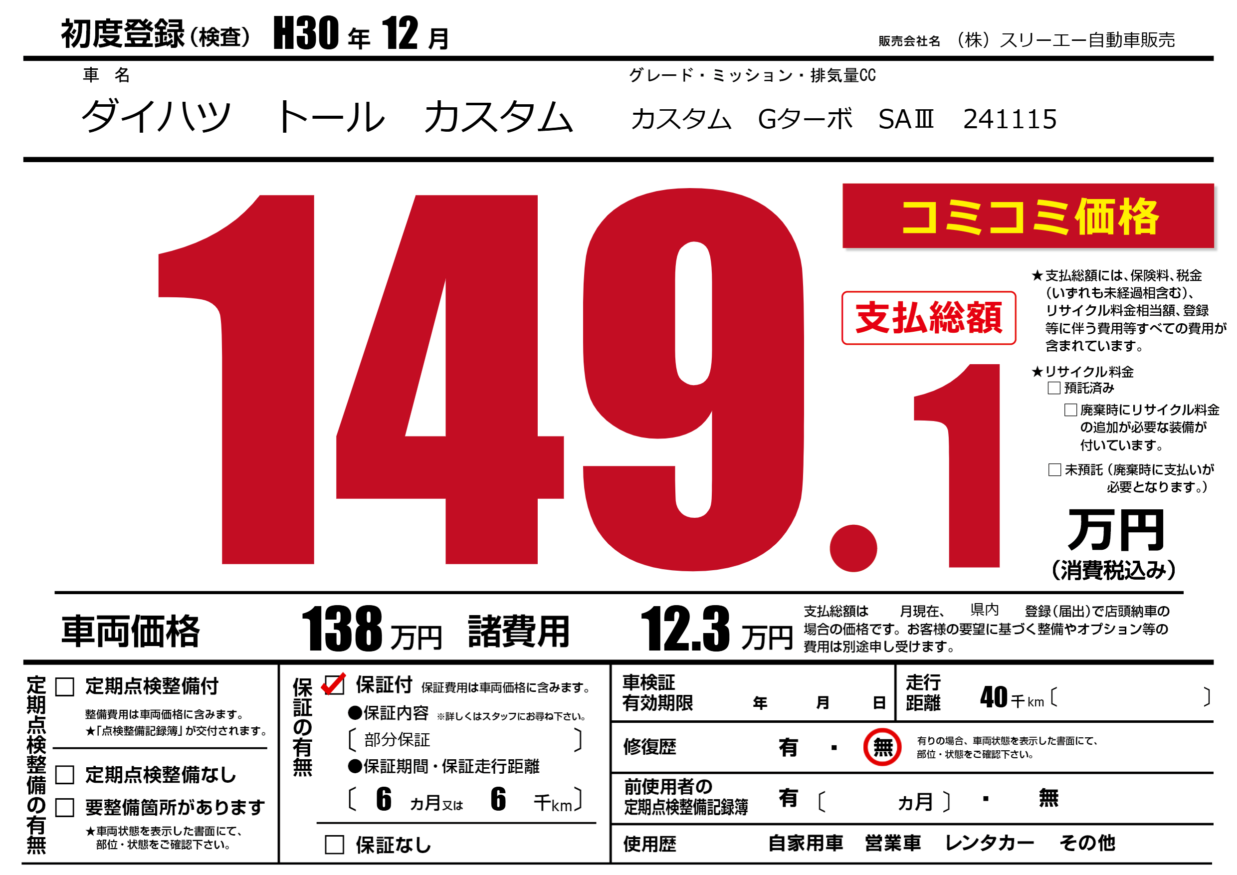 | 走行キロ | 4万km | 初年度登録 | H30年12月 |