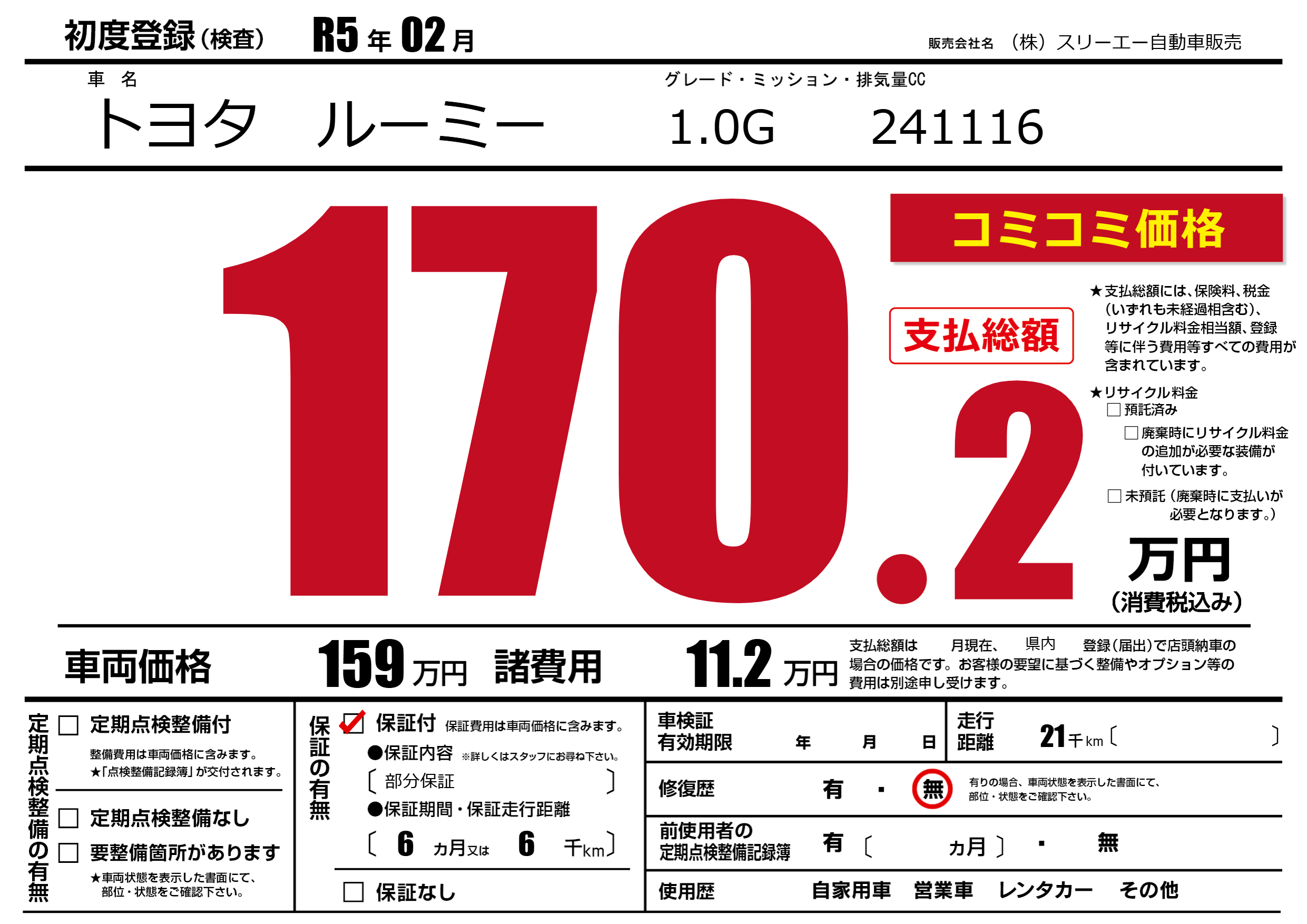 保証付き 保証内容(部分保証) 6ヶ月または(6)千kmまで |