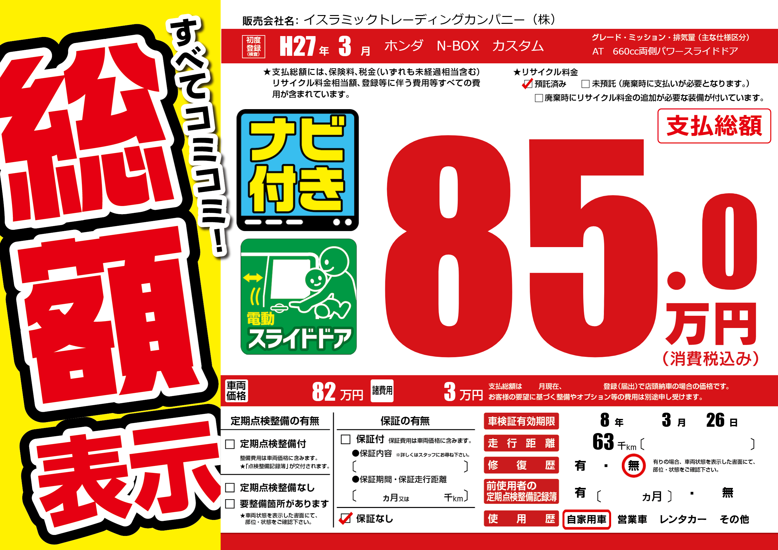| 車名 | ホンダ N-BOX カスタム | グレード ミッション 排気量 |