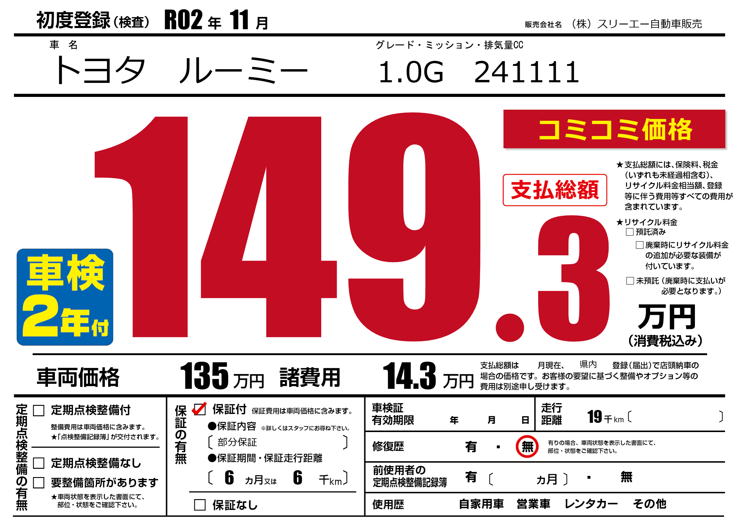 | 車名 | トヨタ ルーミー | グレード ミッション 排気量 |