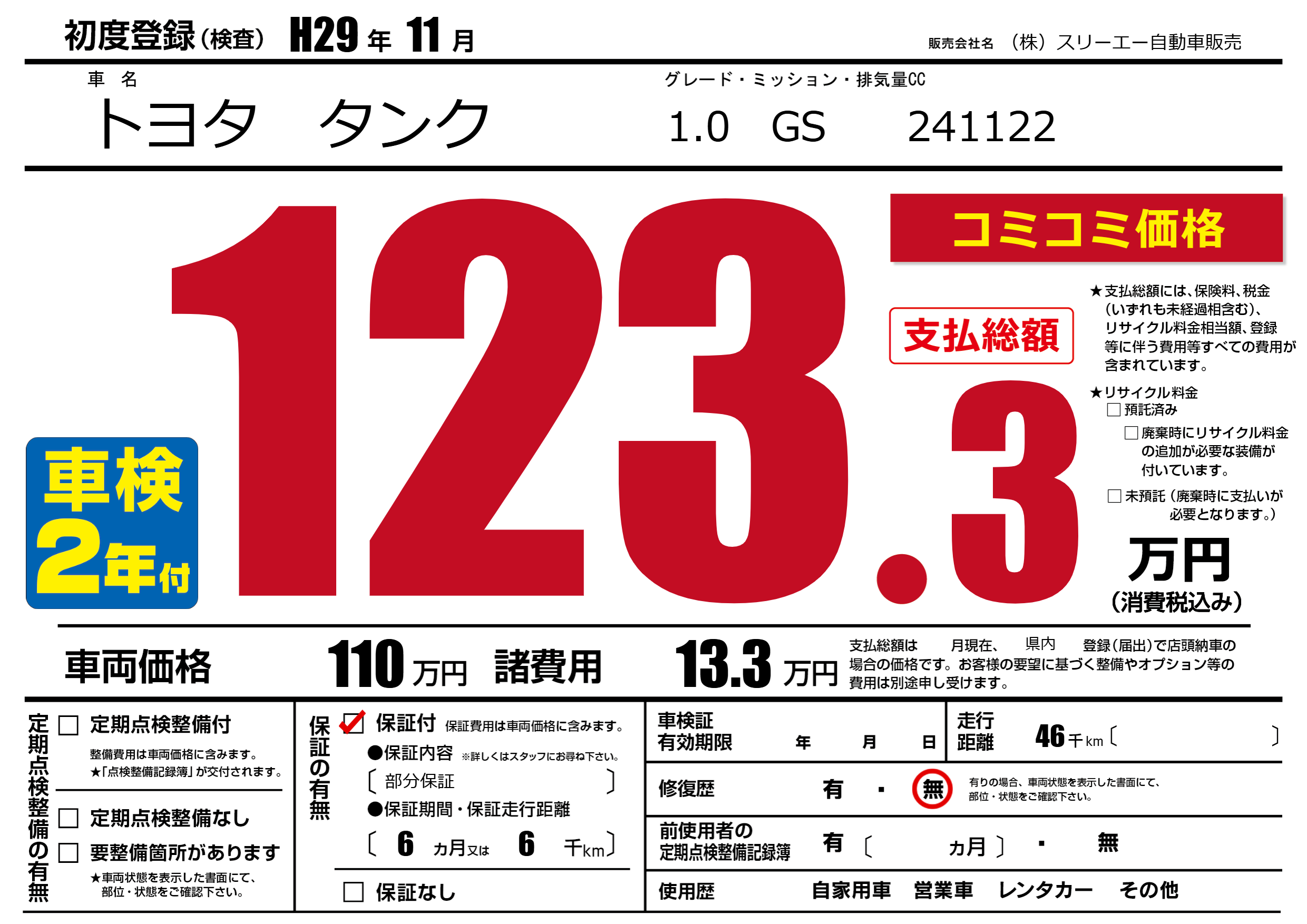 | 車名 | トヨタ タンク | グレード ミッション 排気量 |