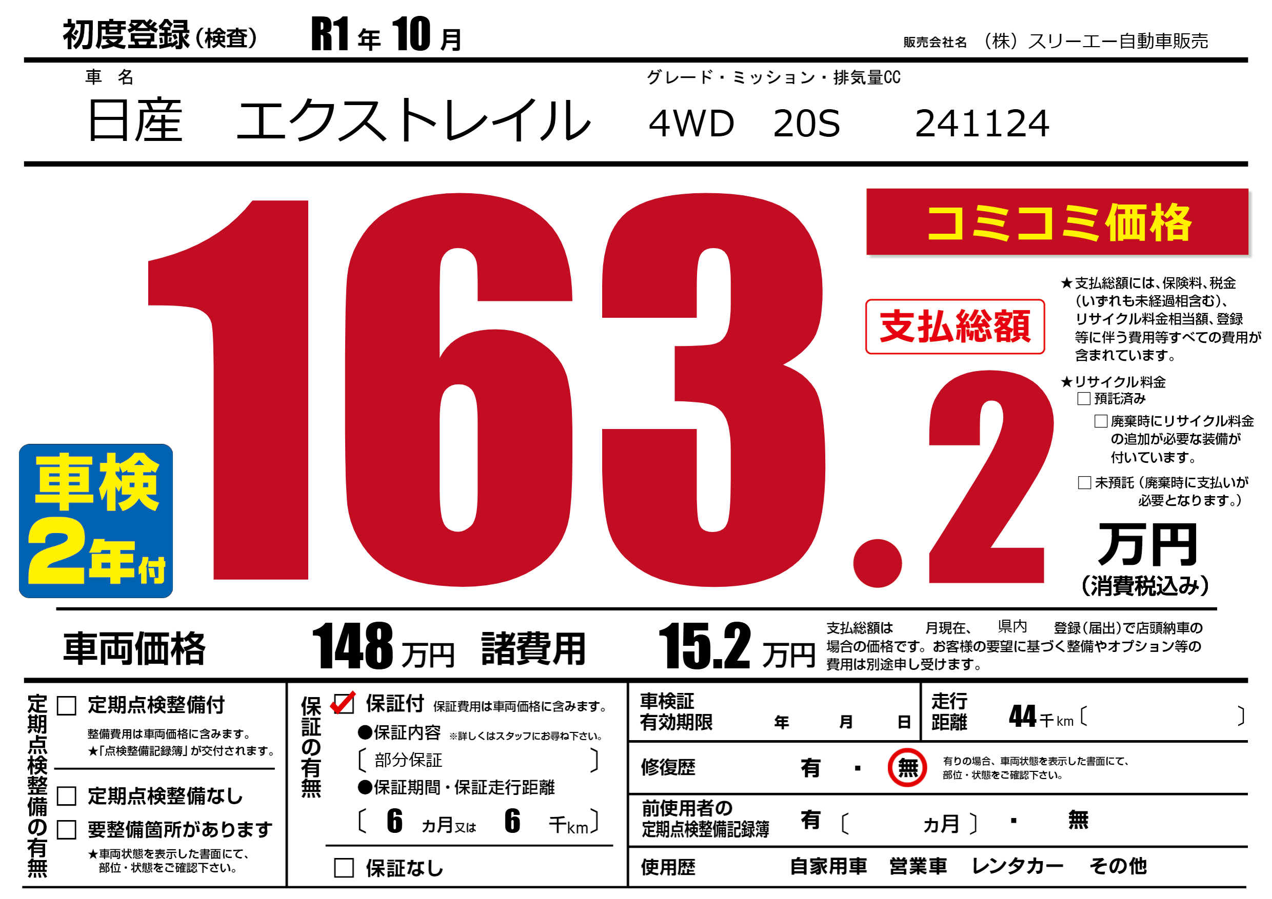保証付き 保証内容(部分保証) 6ヶ月または(6)千kmまで |