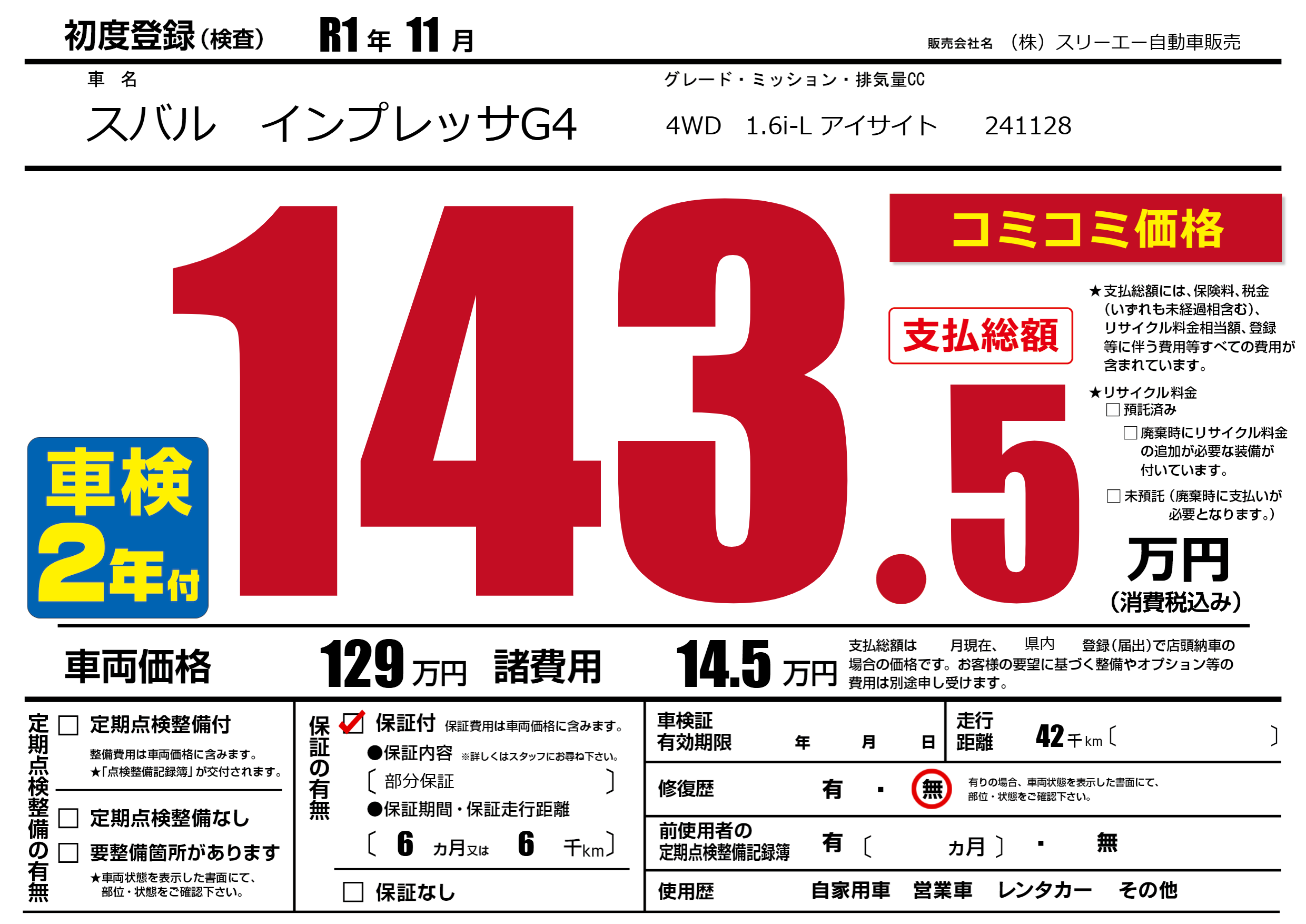 | 車名 | スバル インプレッサG4 | グレード ミッション 排気量 |