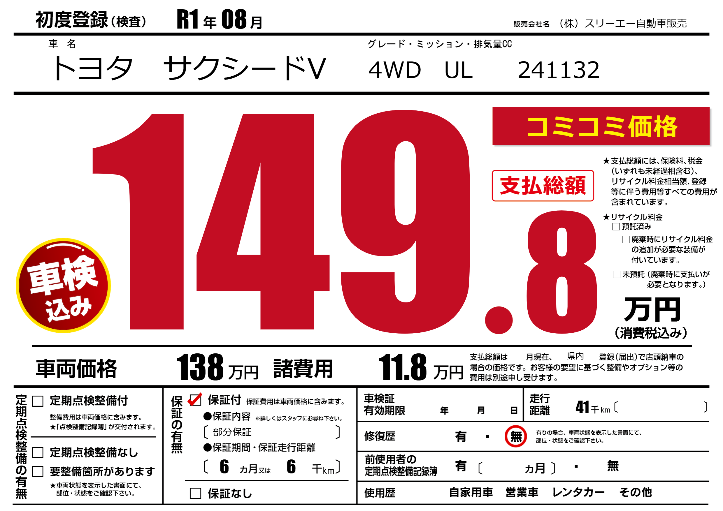 保証付き 保証内容(部分保証) 6ヶ月または(6)千kmまで |