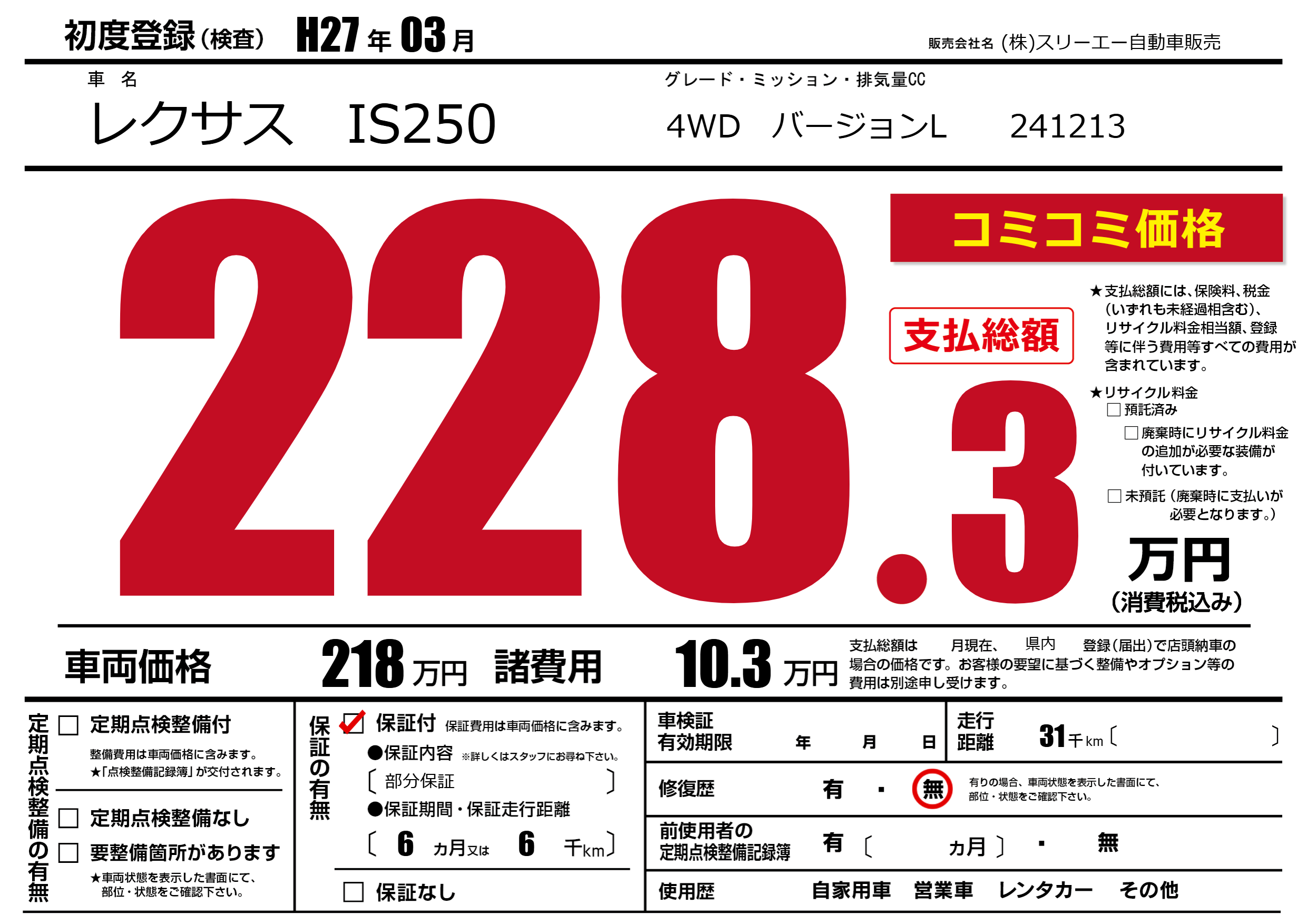 | 車名 | レクサス IS250 | グレード ミッション 排気量 |
