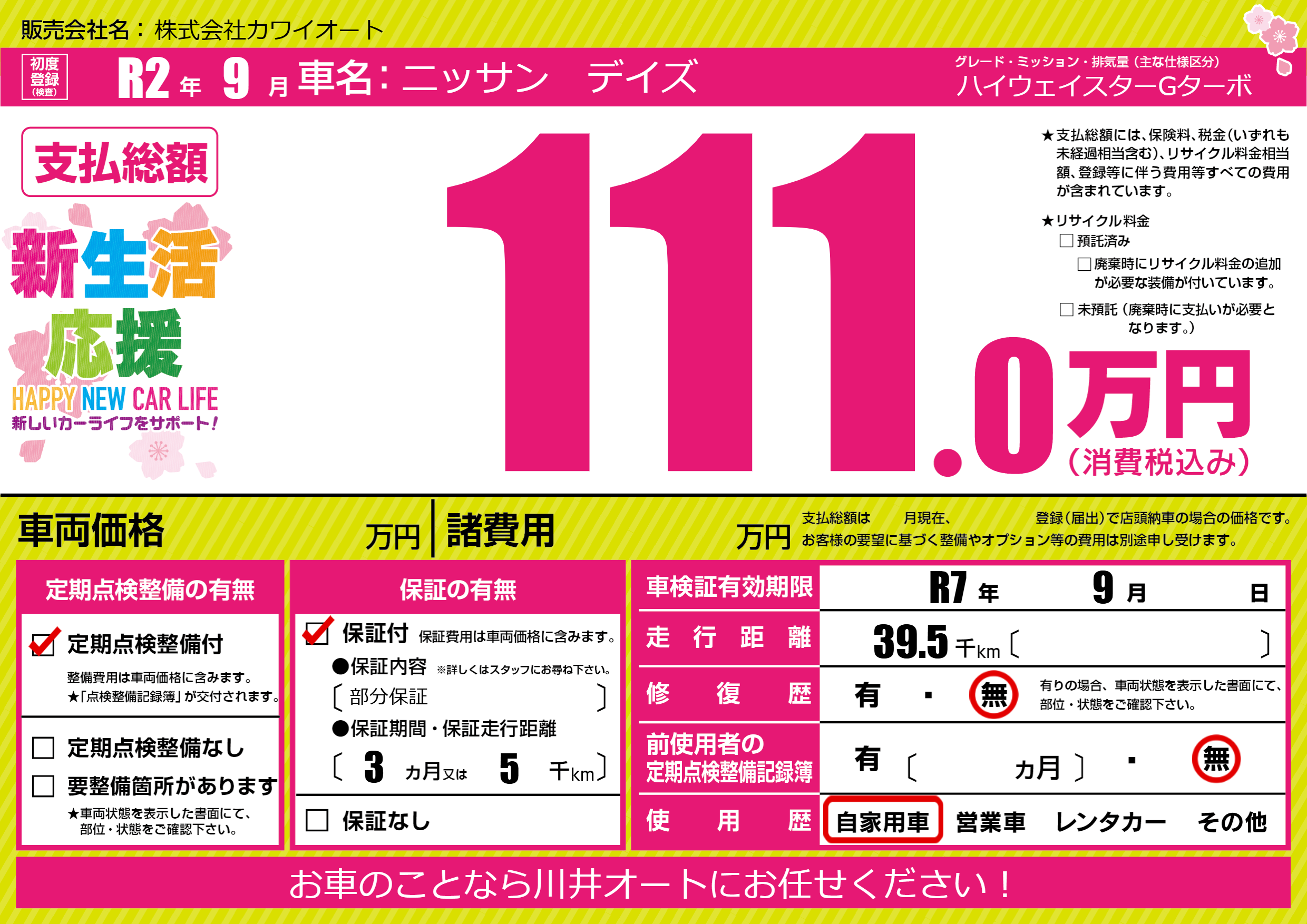 保証付き 保証内容(部分保証) 3ヶ月または(5)千kmまで |