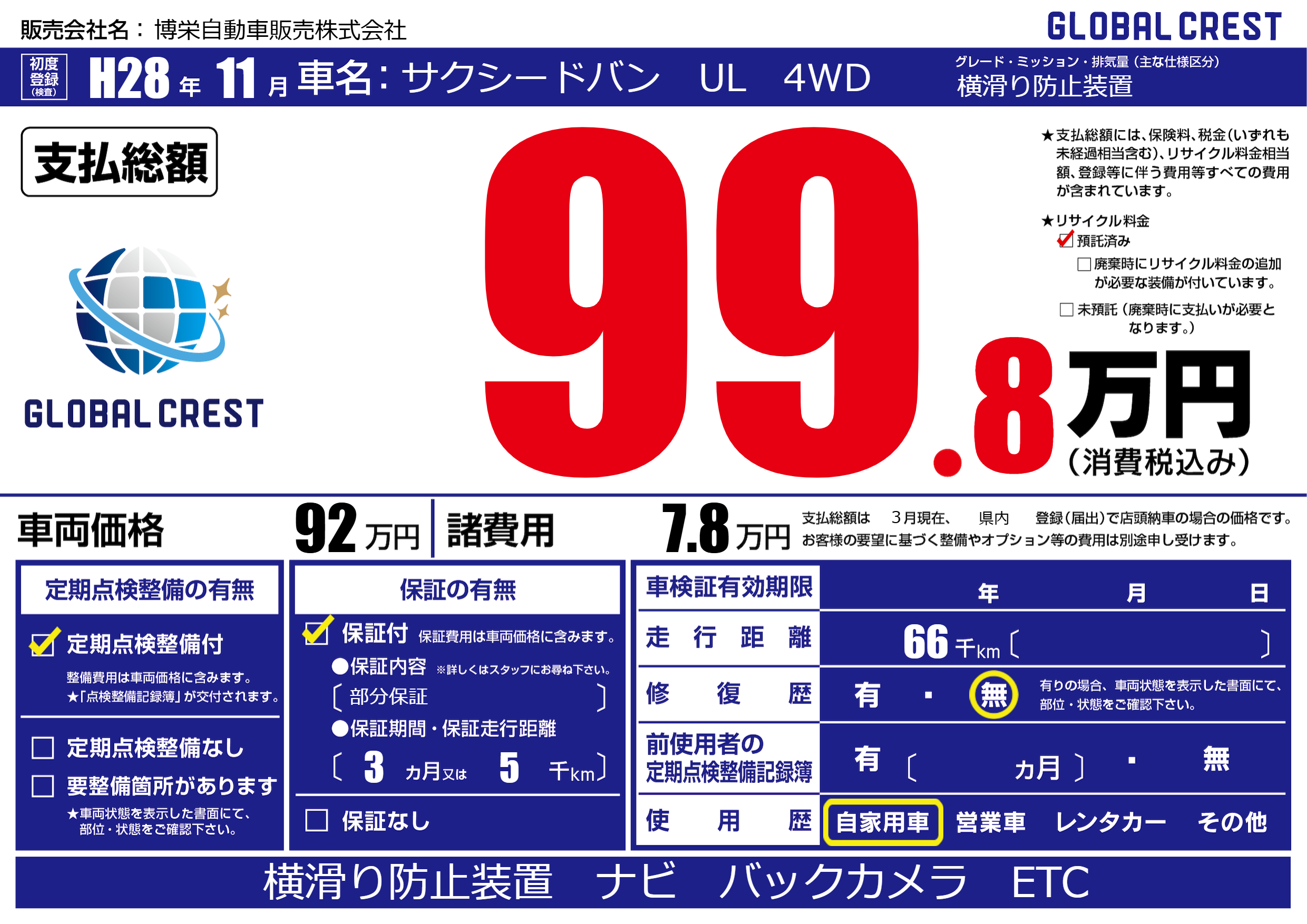 | 車名 | サクシードバン UL 4WD | グレード ミッション 排気量 |