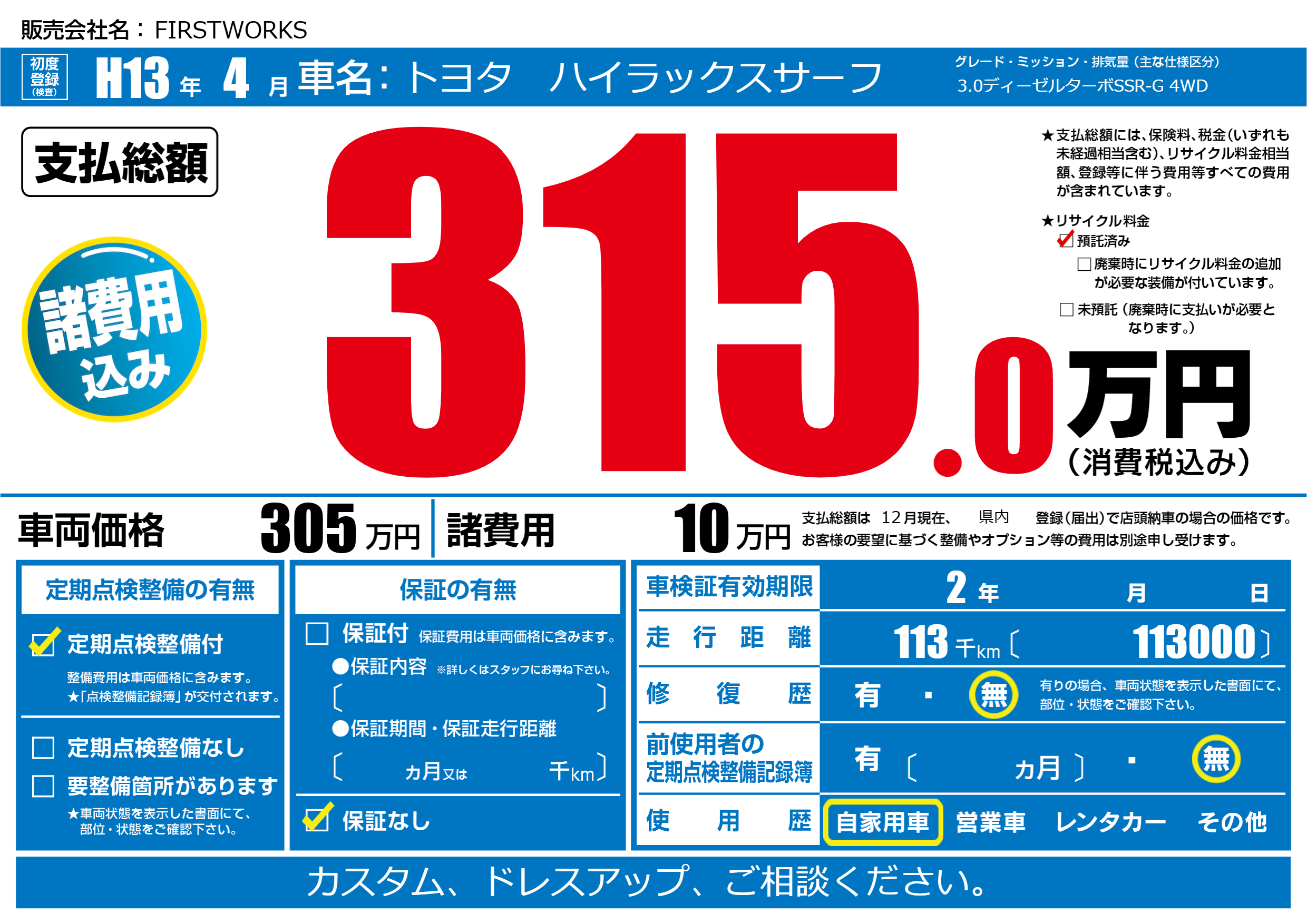 | 車名 | トヨタ ハイラックスサーフ | グレード ミッション 排気量 |