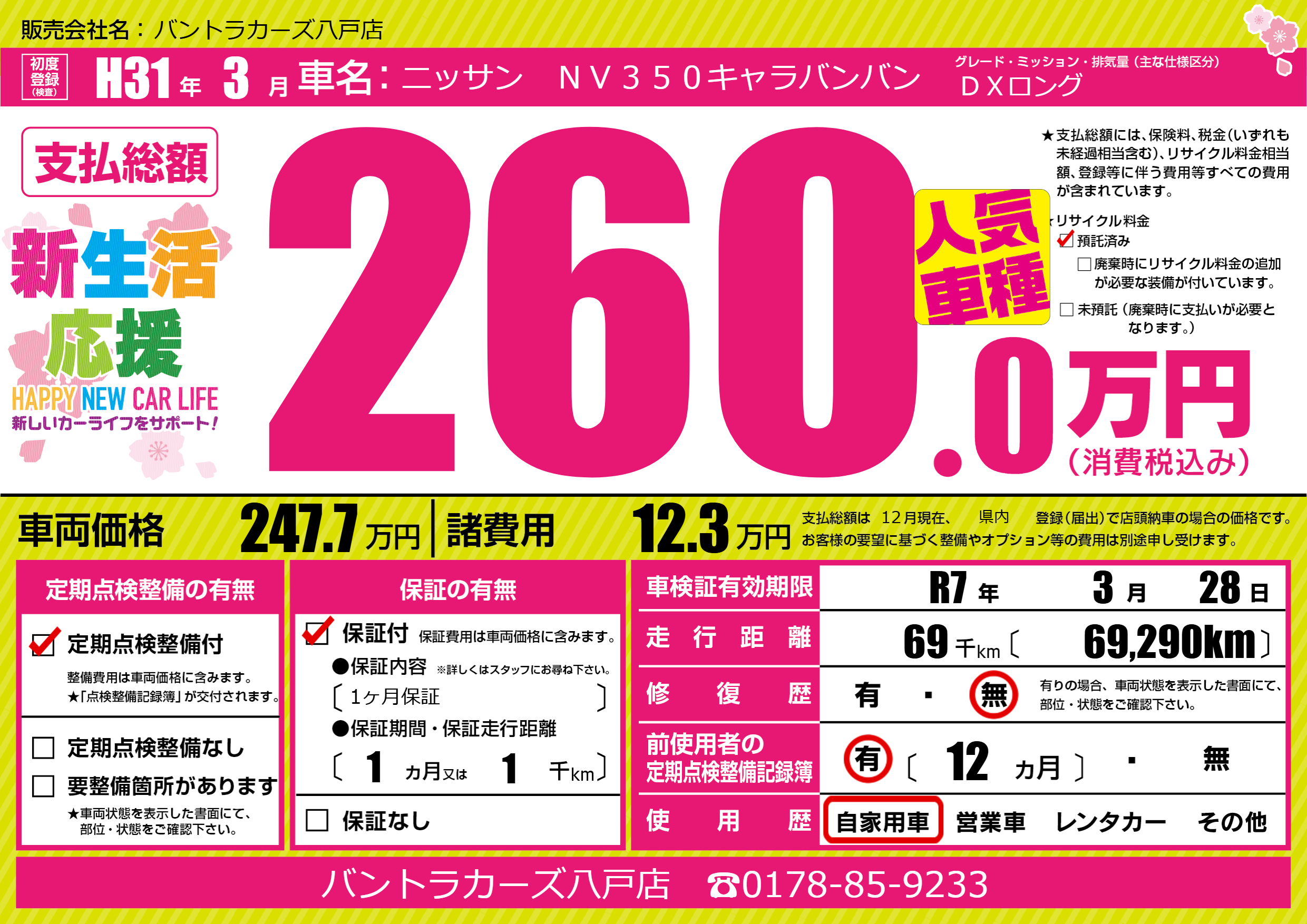 | 車名 | ニッサン NV350キャラバンバン | グレード ミッション 排気量 |