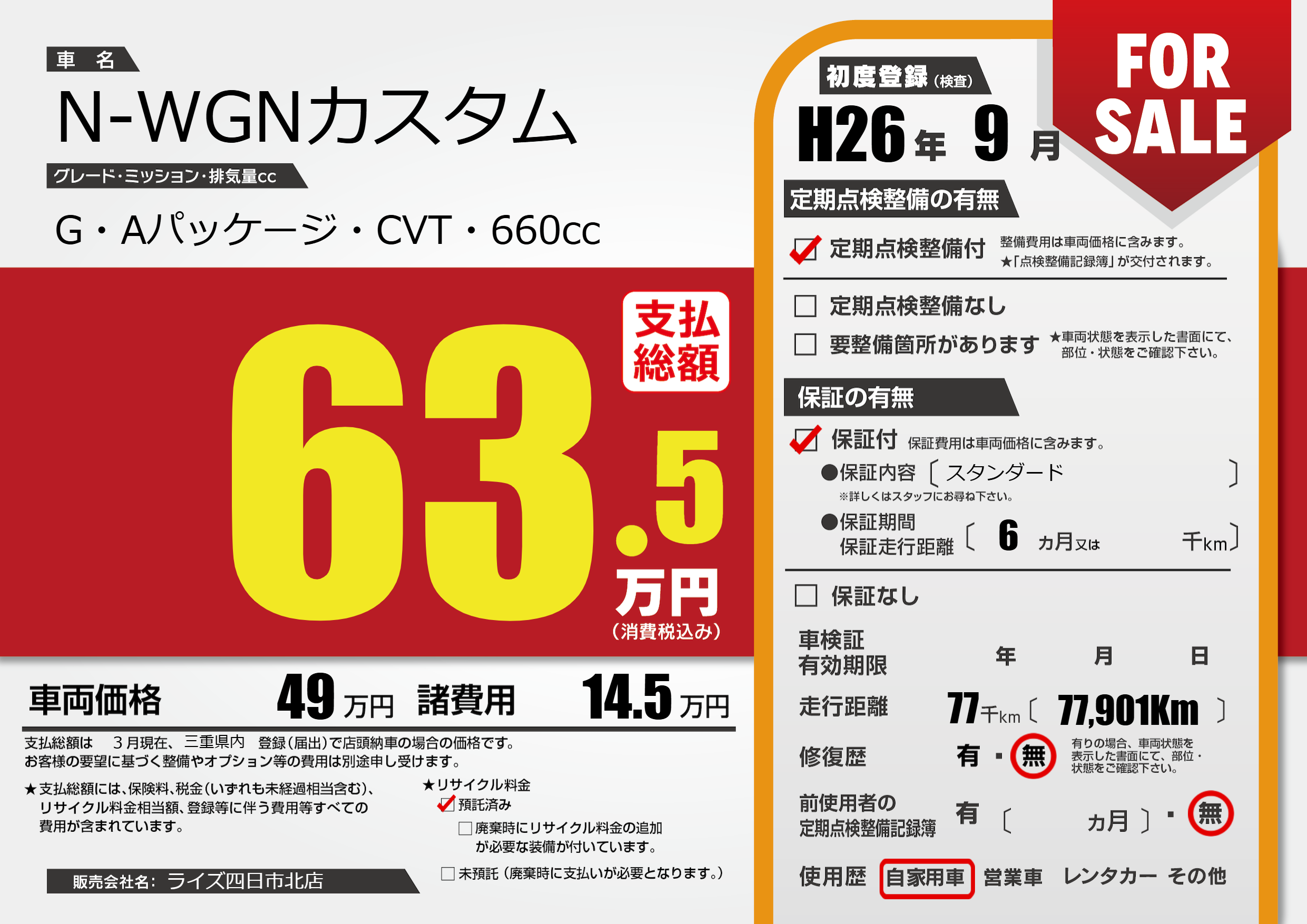 | 車名 | N-WGNカスタム | グレード ミッション 排気量 |