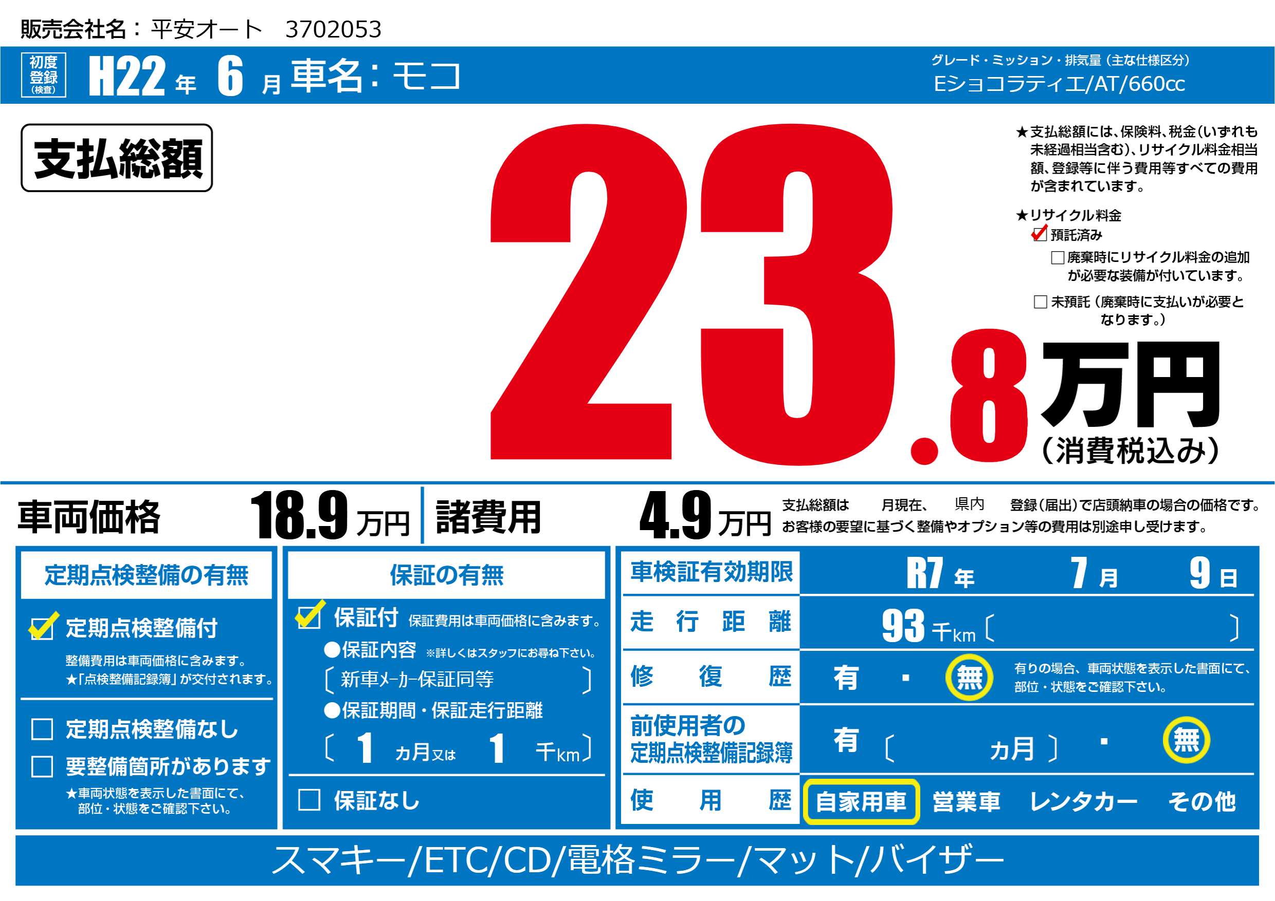 なし | 車検制限 | R7年7月9月 |