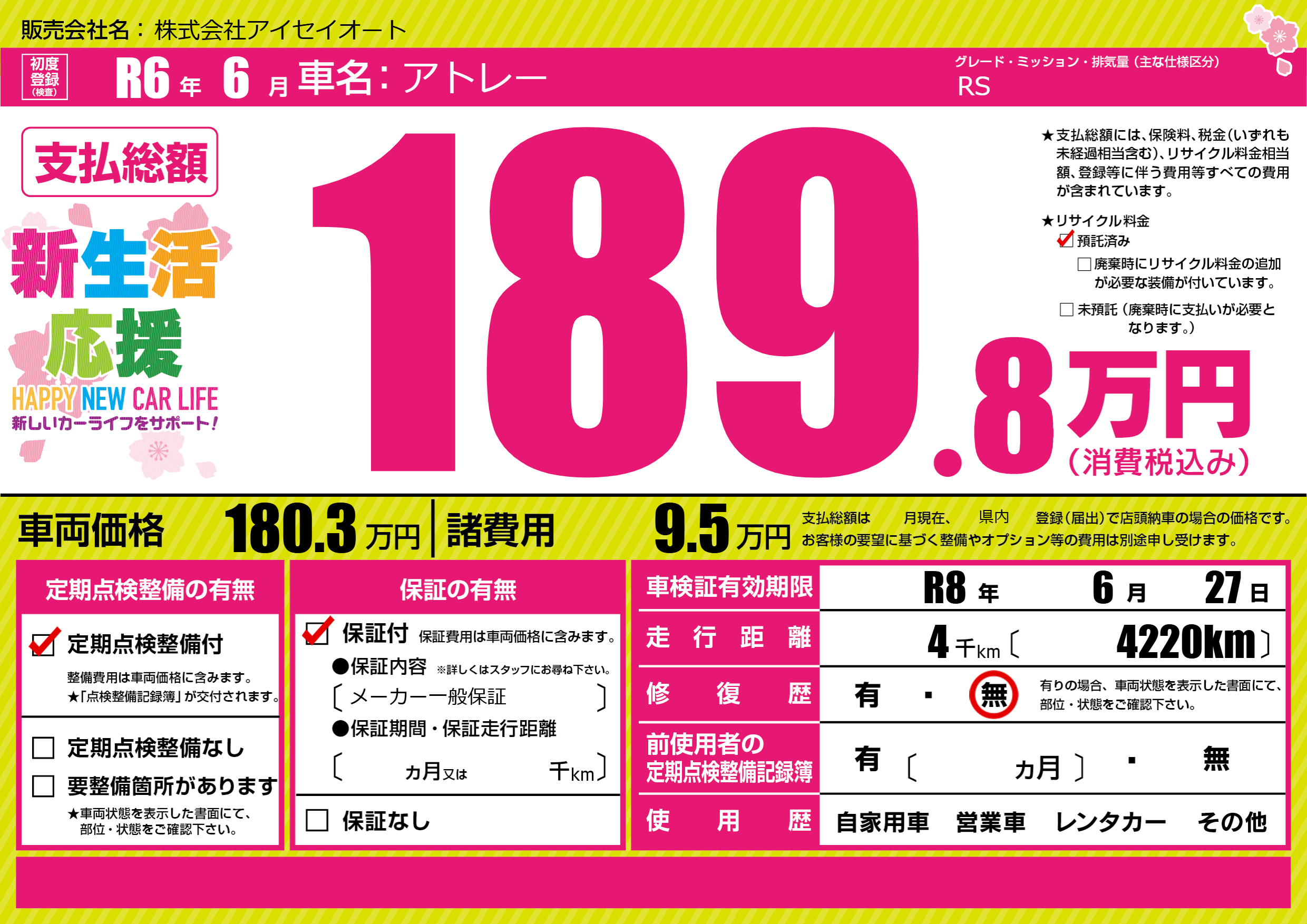 なし | 車検制限 | R8年6月27月 |