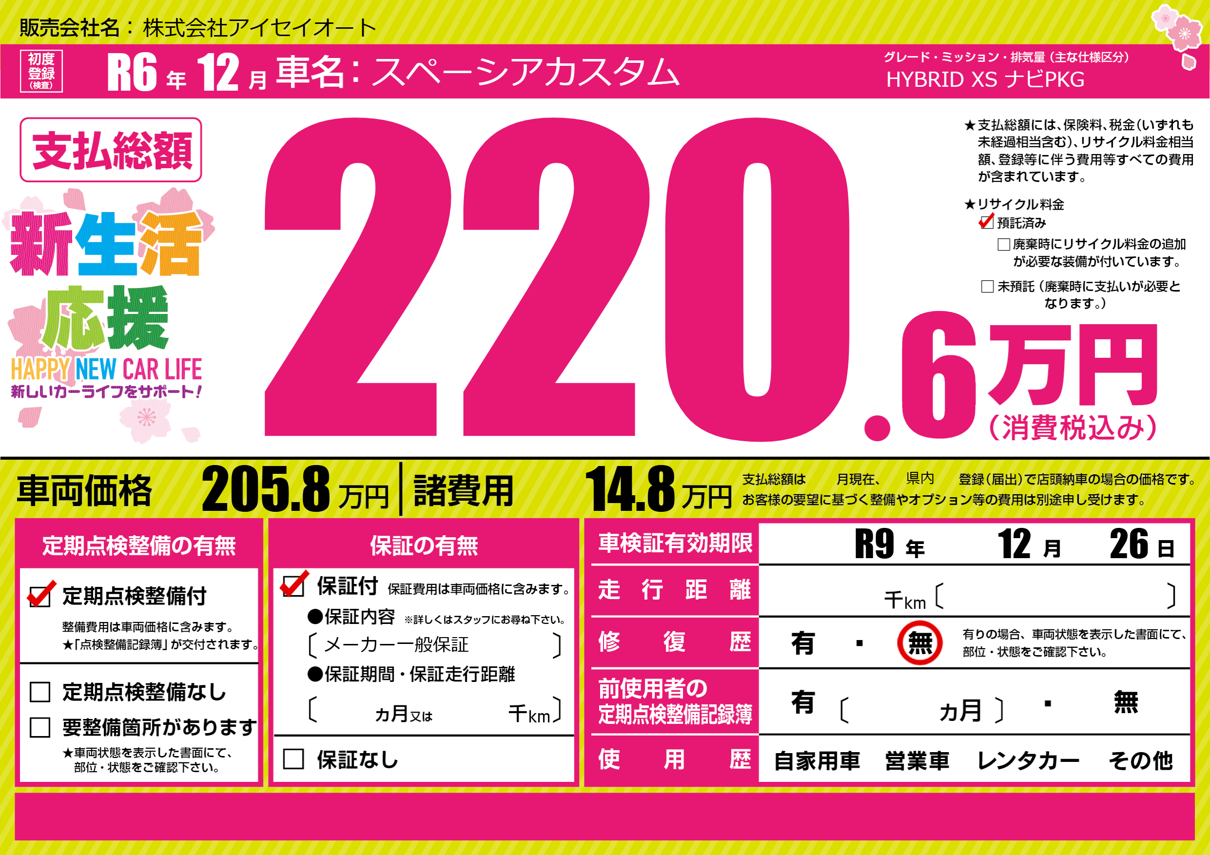 なし | 車検制限 | R9年12月26月 |