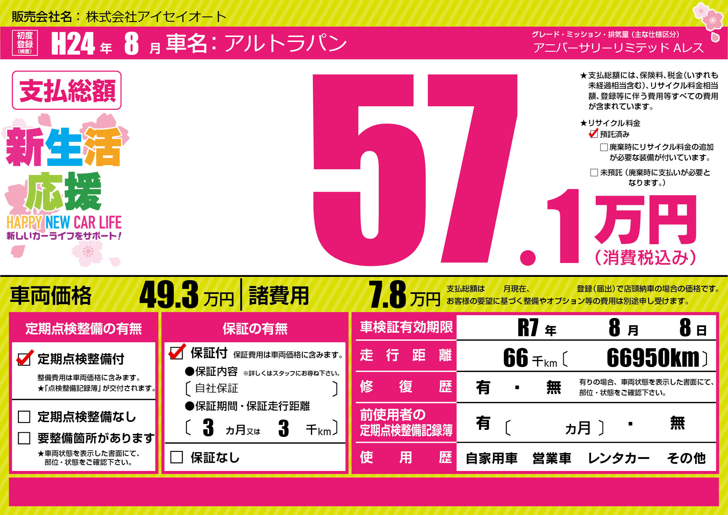 | 走行キロ | 6.6万km | 初年度登録 | H24年8月 |