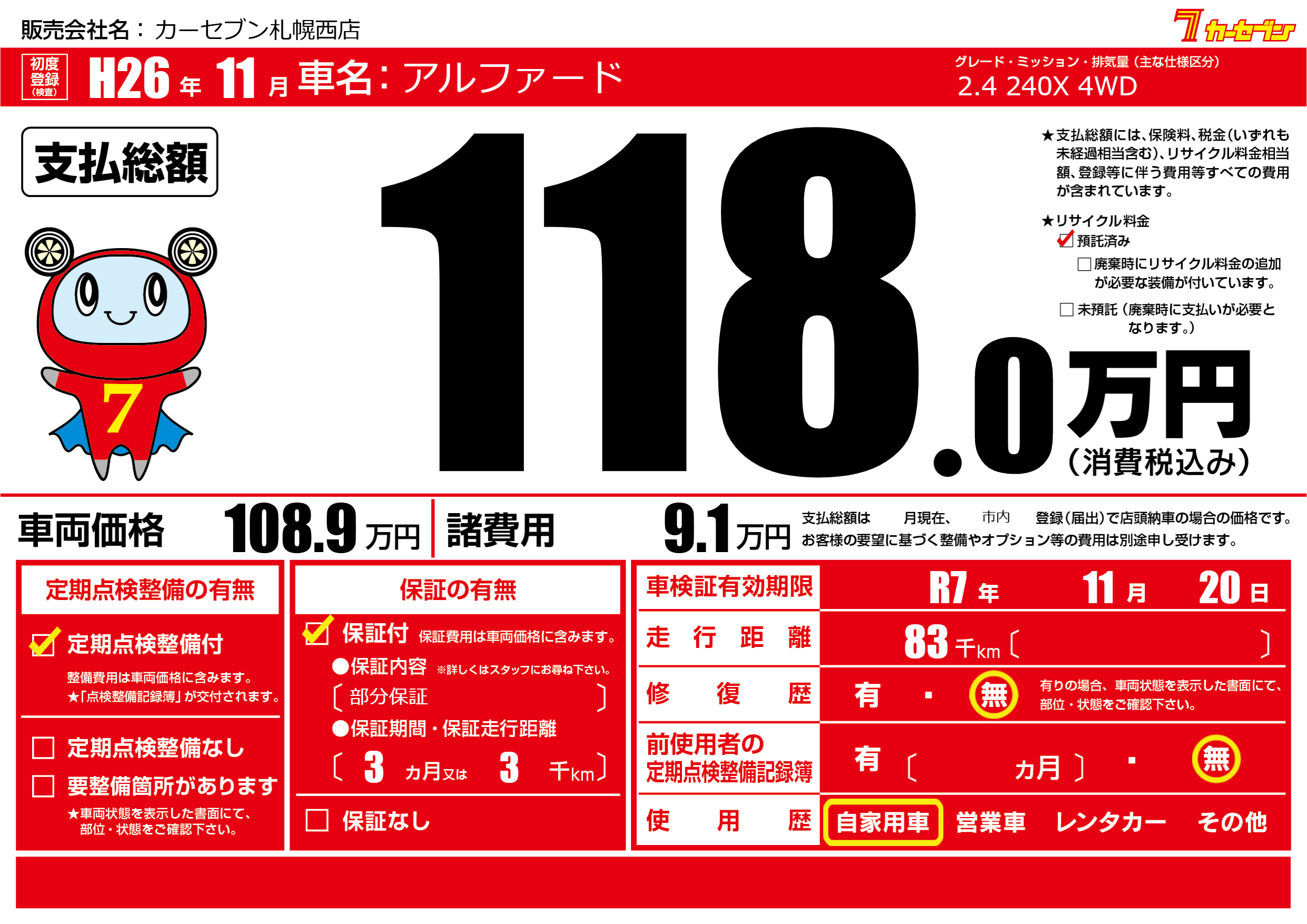 | 走行キロ | 8.3万km | 初年度登録 | H26年11月 |
