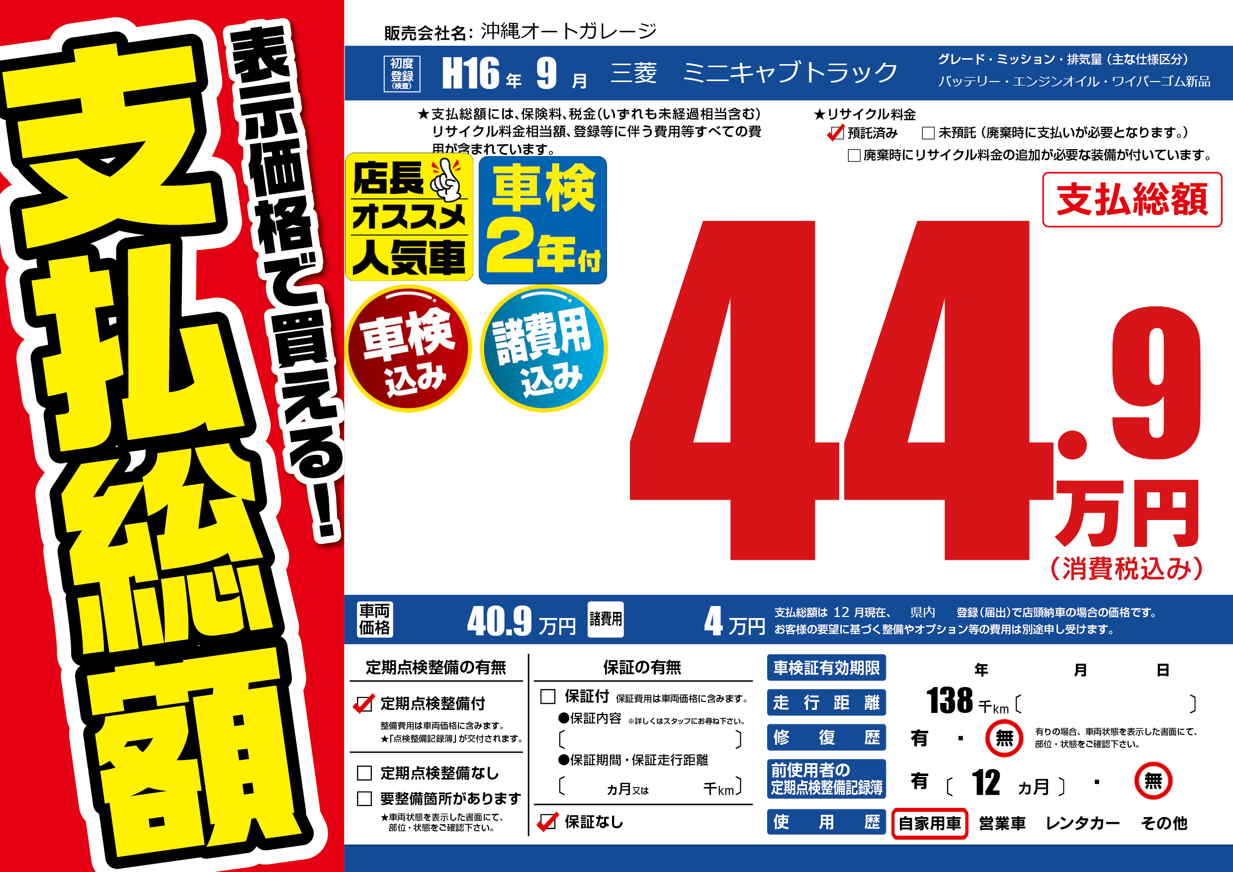 | 車名 | 三菱 ミニキャブトラック | グレード ミッション 排気量 |