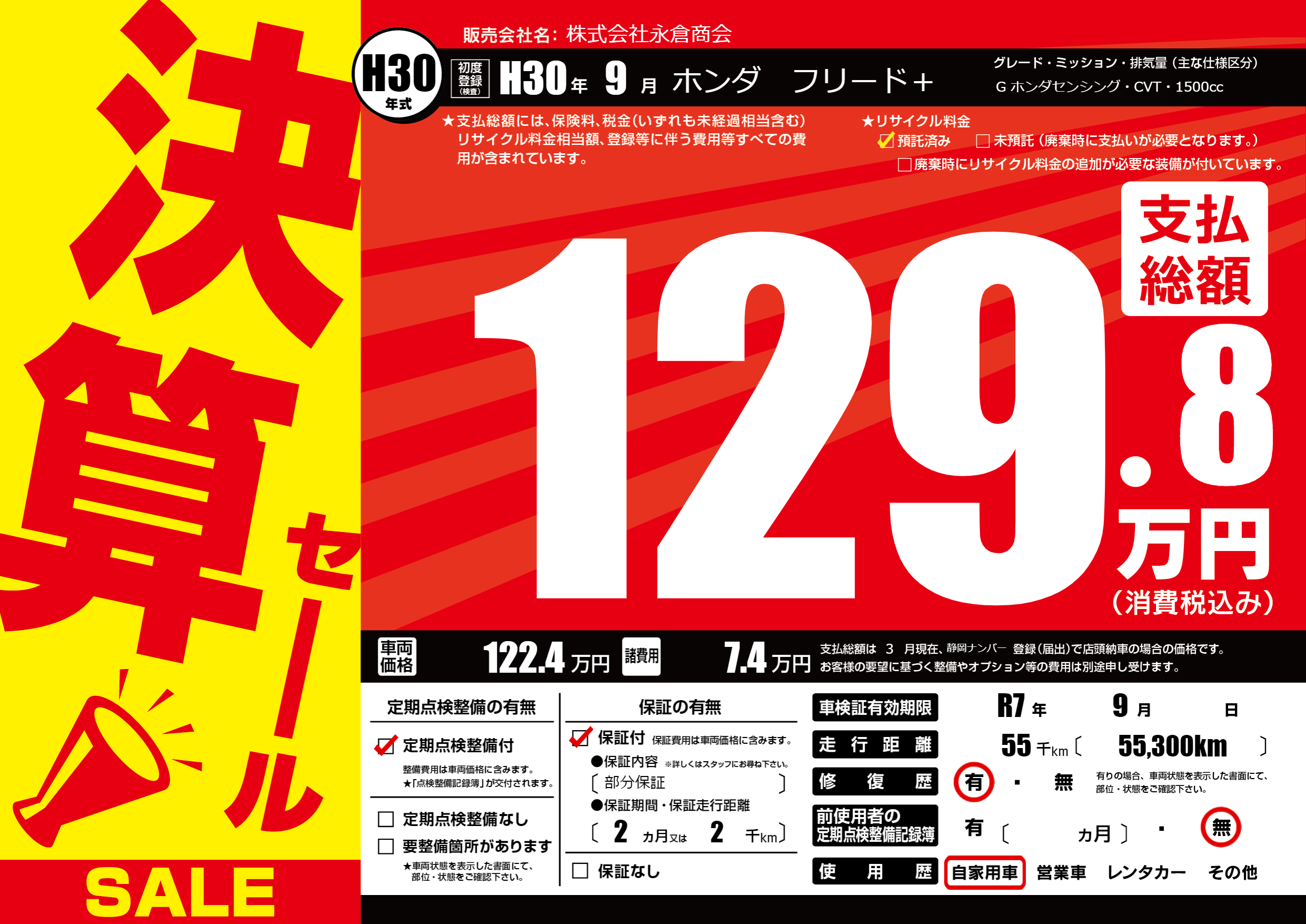 | 走行キロ | 5.5万km | 初年度登録 | H30年9月 |