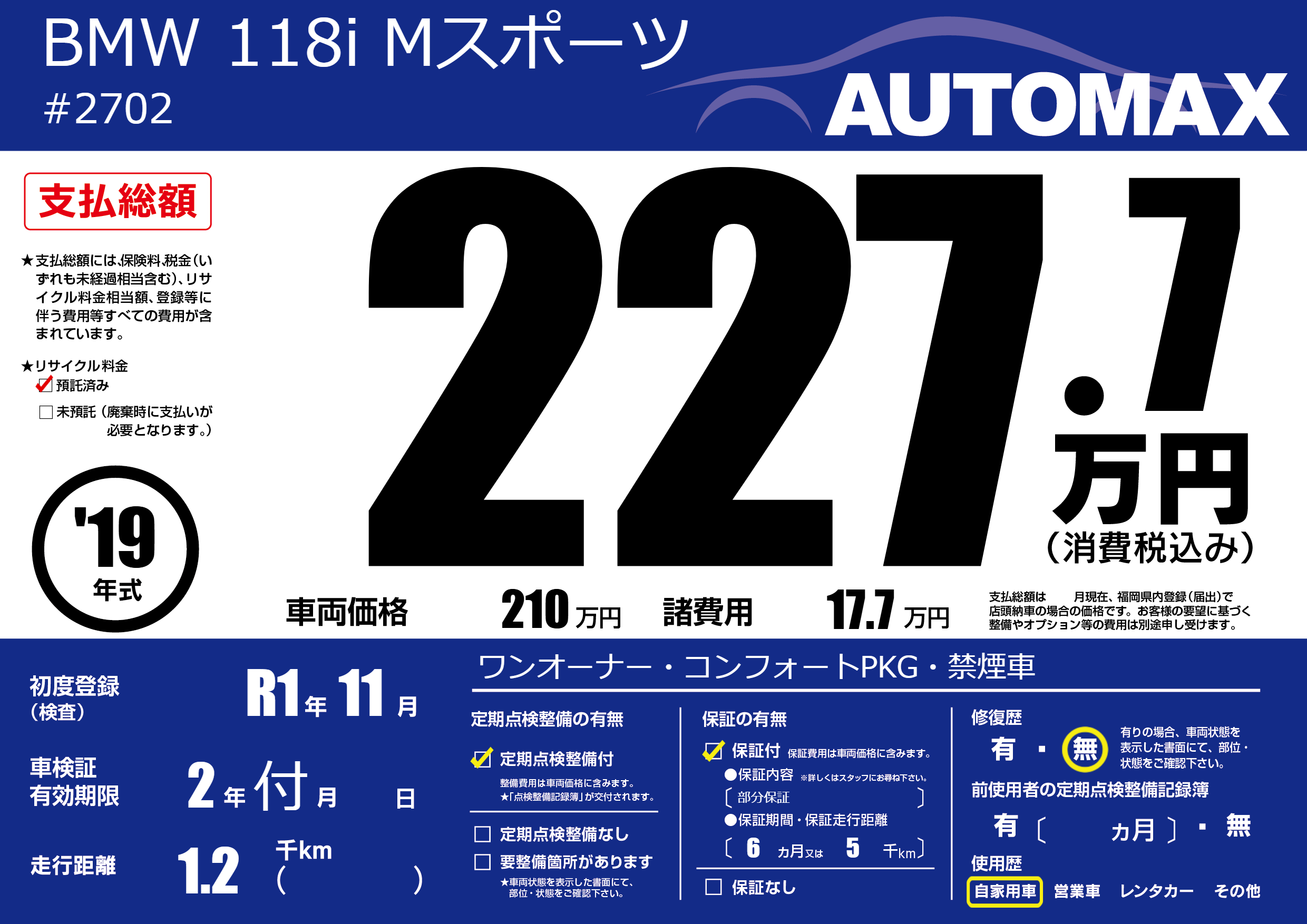 | 車名 | BMW 118i Mスポーツ | グレード ミッション 排気量 |