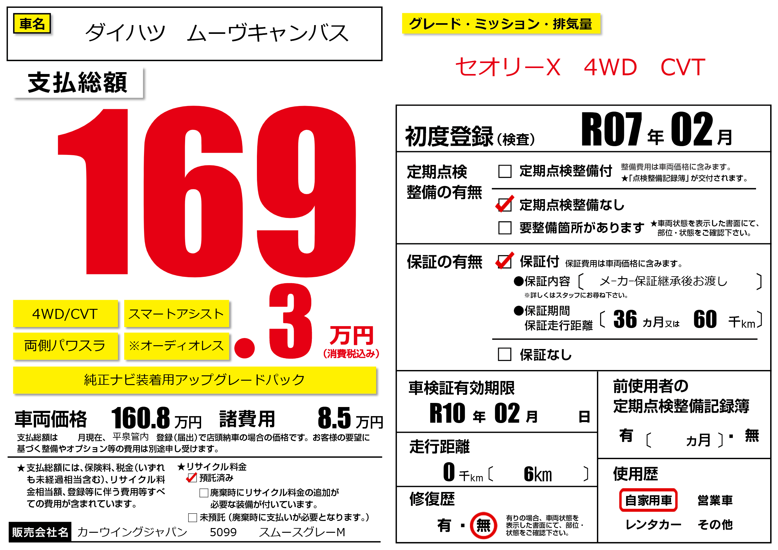| 車名 | ダイハツ ムーヴキャンバス | グレード ミッション 排気量 |
