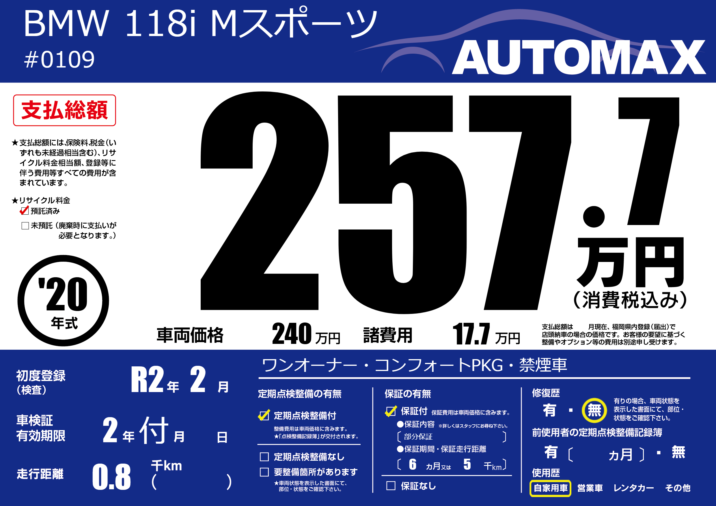 | 車名 | BMW 118i Mスポーツ | グレード ミッション 排気量 |