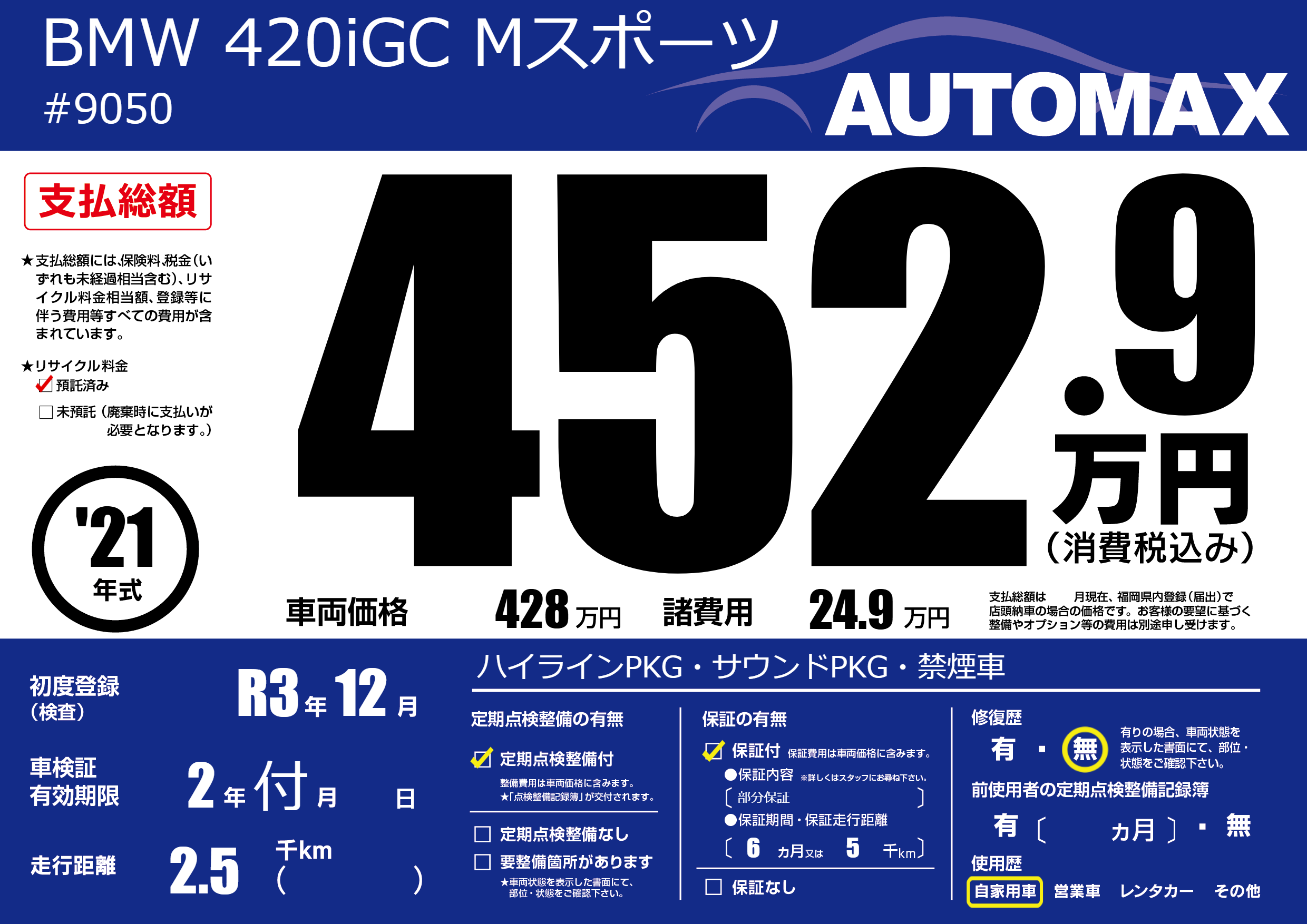 | 車名 | BMW 420iGC Mスポーツ | グレード ミッション 排気量 |