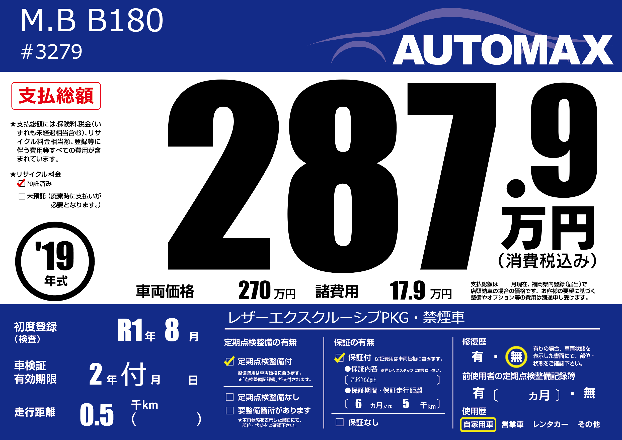 | 車名 | M.B B180 | グレード ミッション 排気量 |