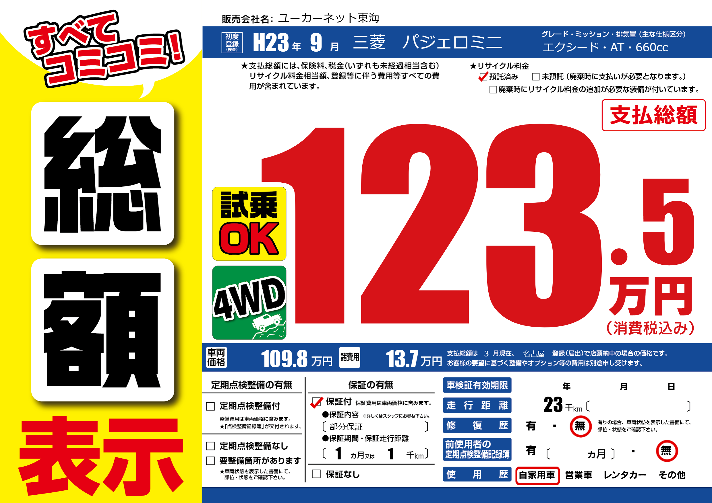 | 車名 | 三菱 パジェロミニ | グレード ミッション 排気量 |
