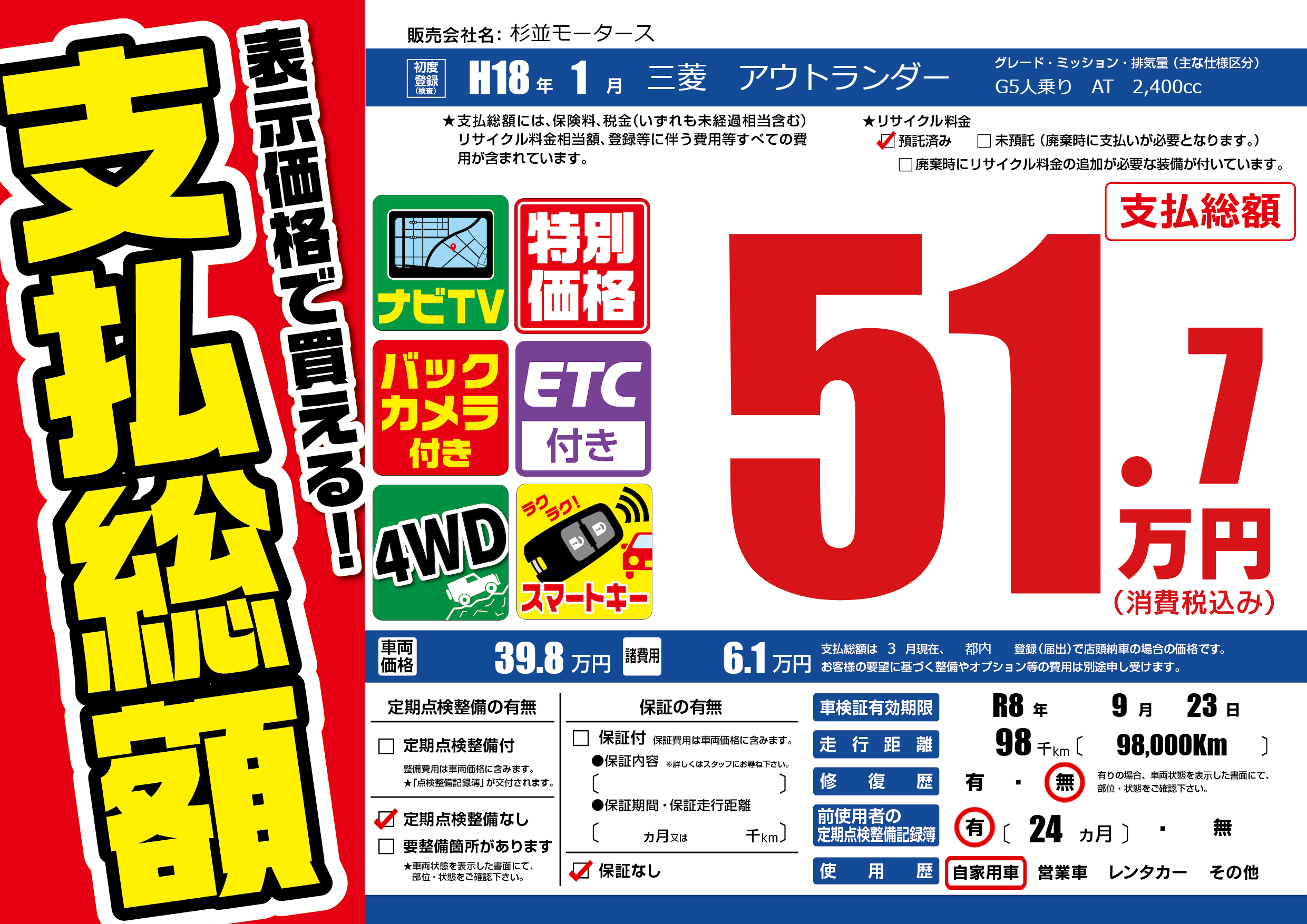 | 走行キロ | 9.8万km | 初年度登録 | H18年1月 |
