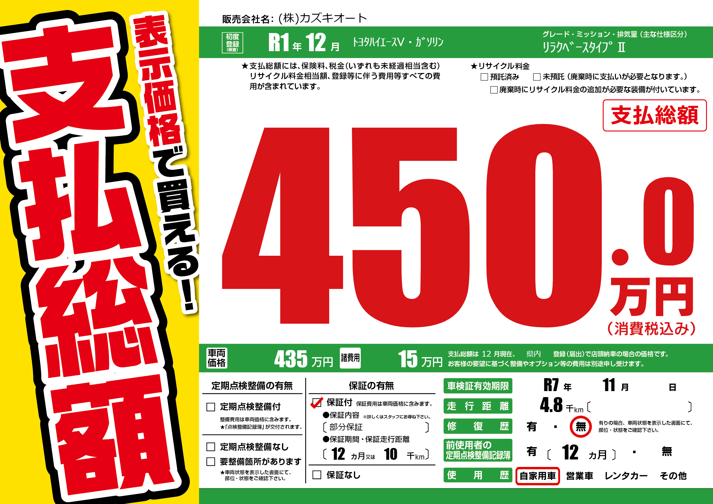| 走行キロ | 0.4万km | 初年度登録 | R1年12月 |