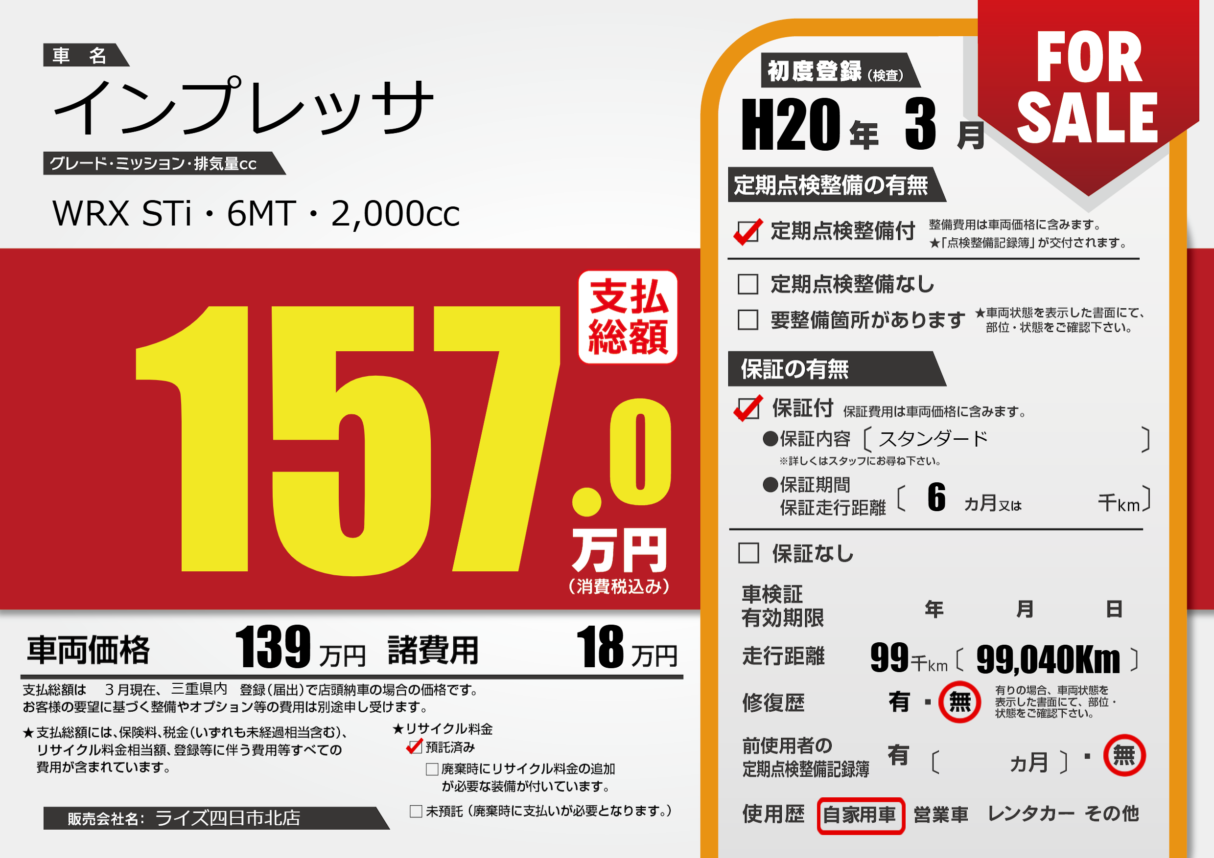 | 車名 | インプレッサ | グレード ミッション 排気量 |