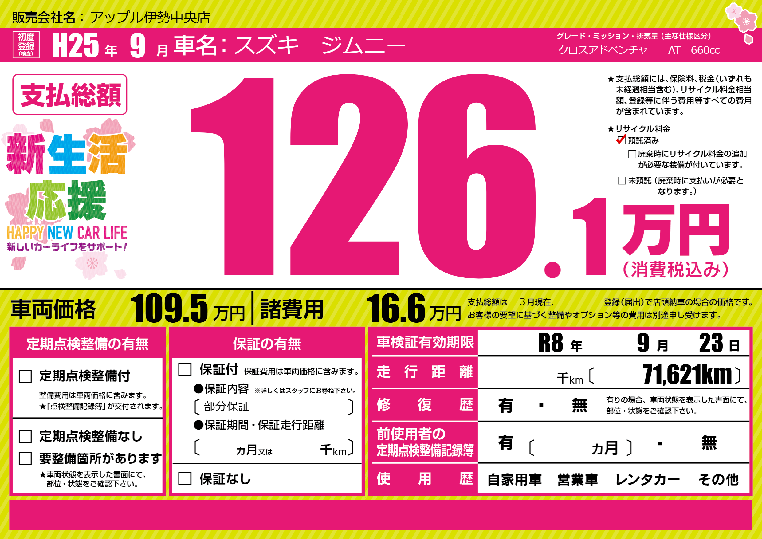 あり | リサイクル預託金相当額 | ( 0円)が別途必要 |