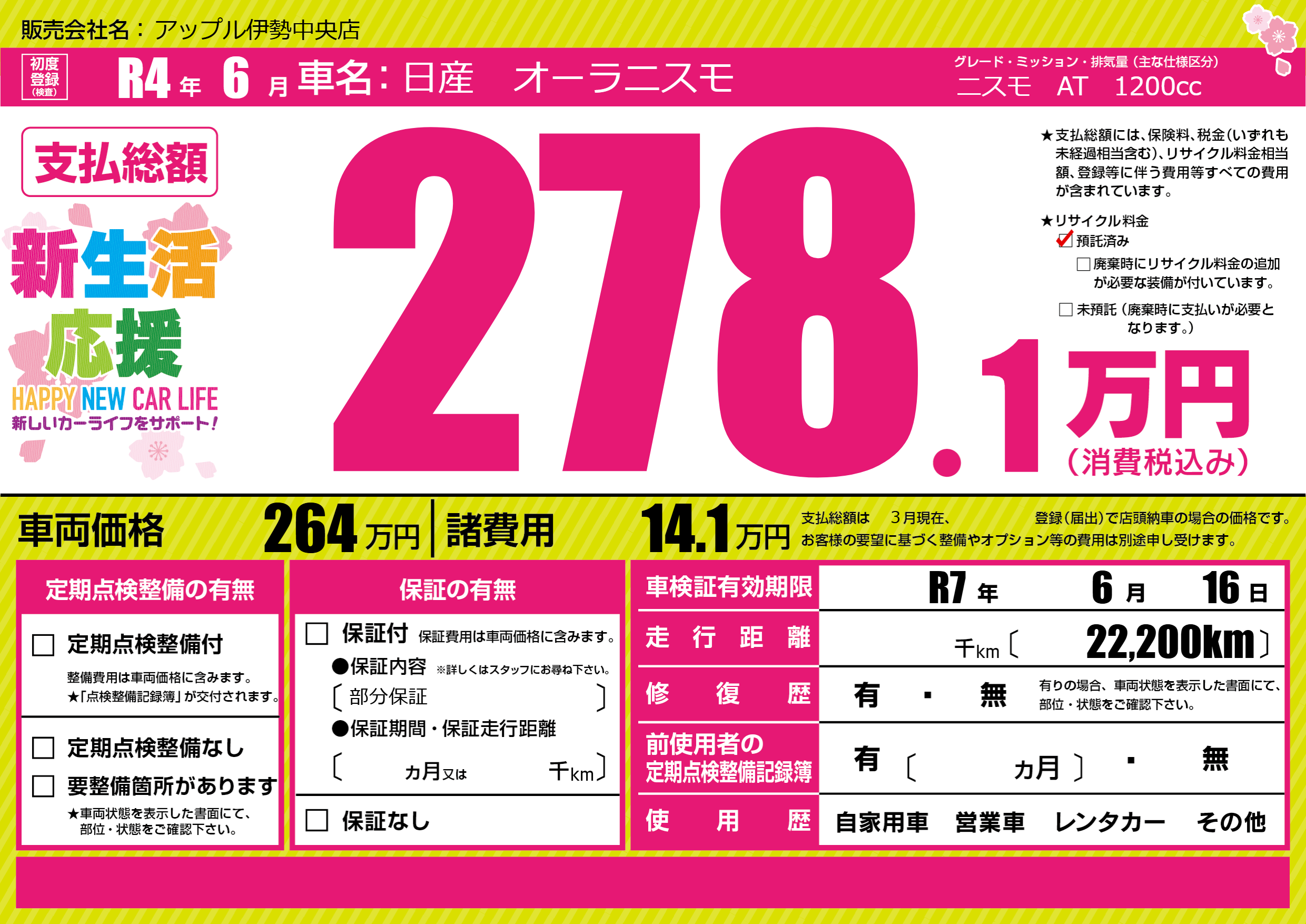 | 車名 | 日産 オーラニスモ | グレード ミッション 排気量 |