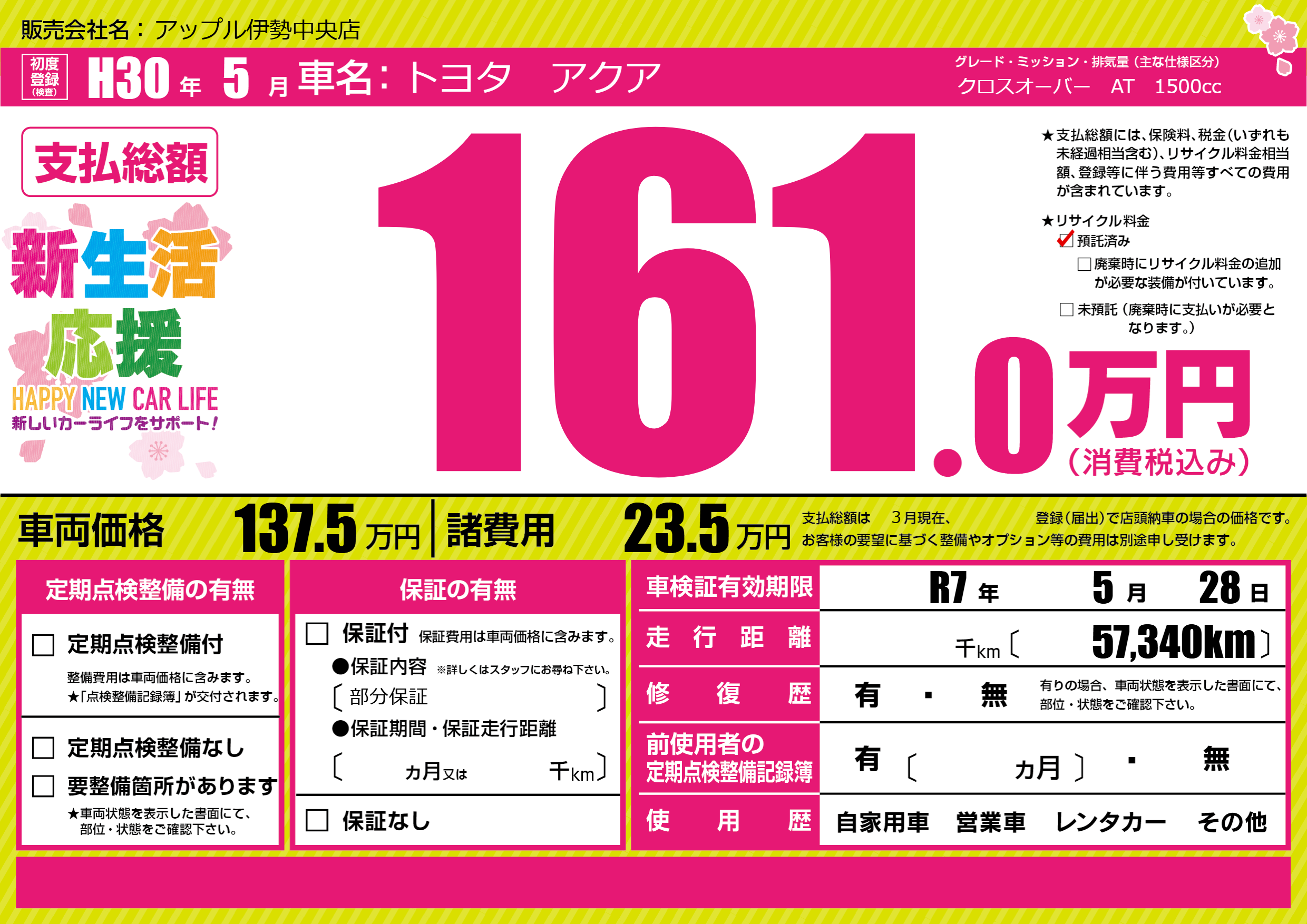 あり | リサイクル預託金相当額 | ( 0円)が別途必要 |