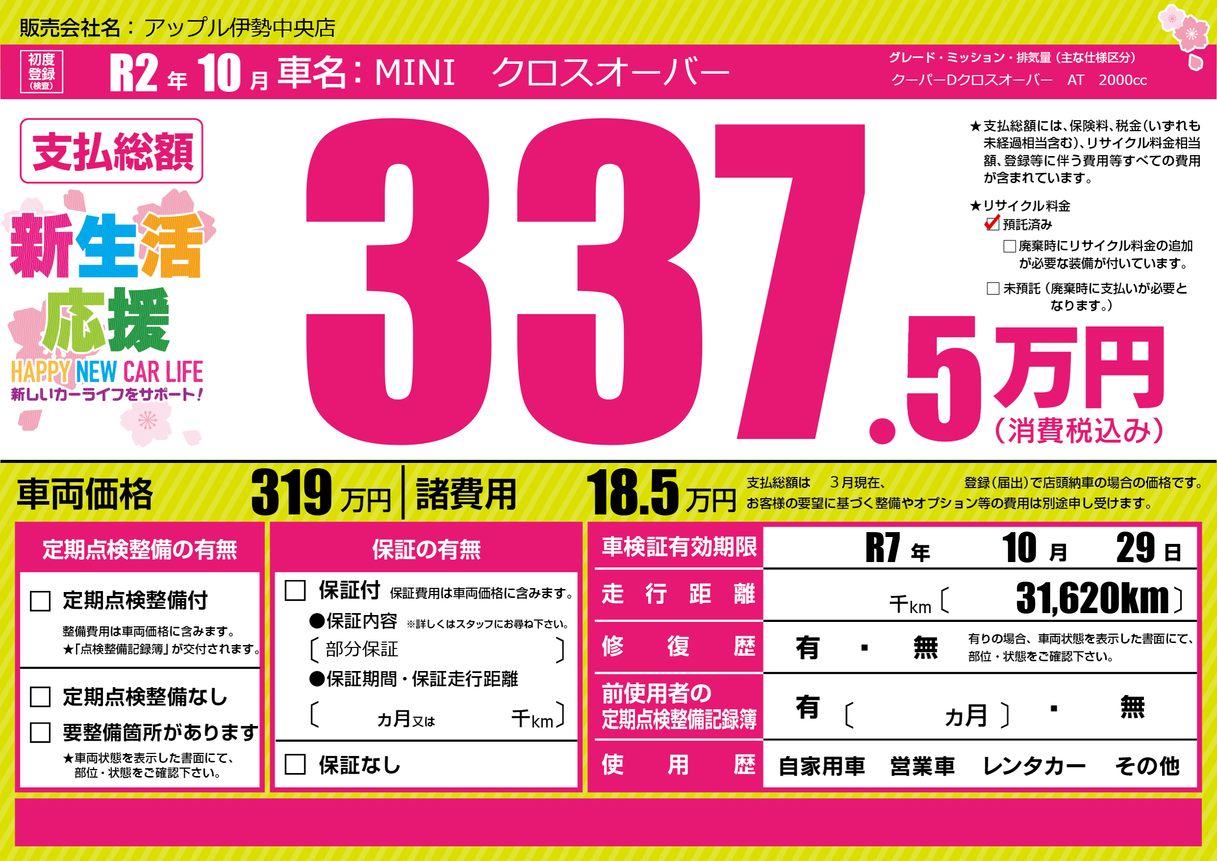 | 車名 | MINI クロスオーバー | グレード ミッション 排気量 |