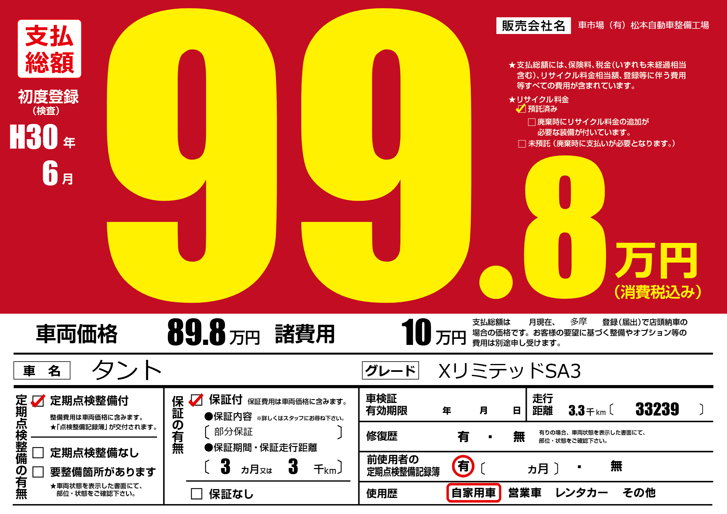 | 走行キロ | 0.3万km | 初年度登録 | H30年6月 |