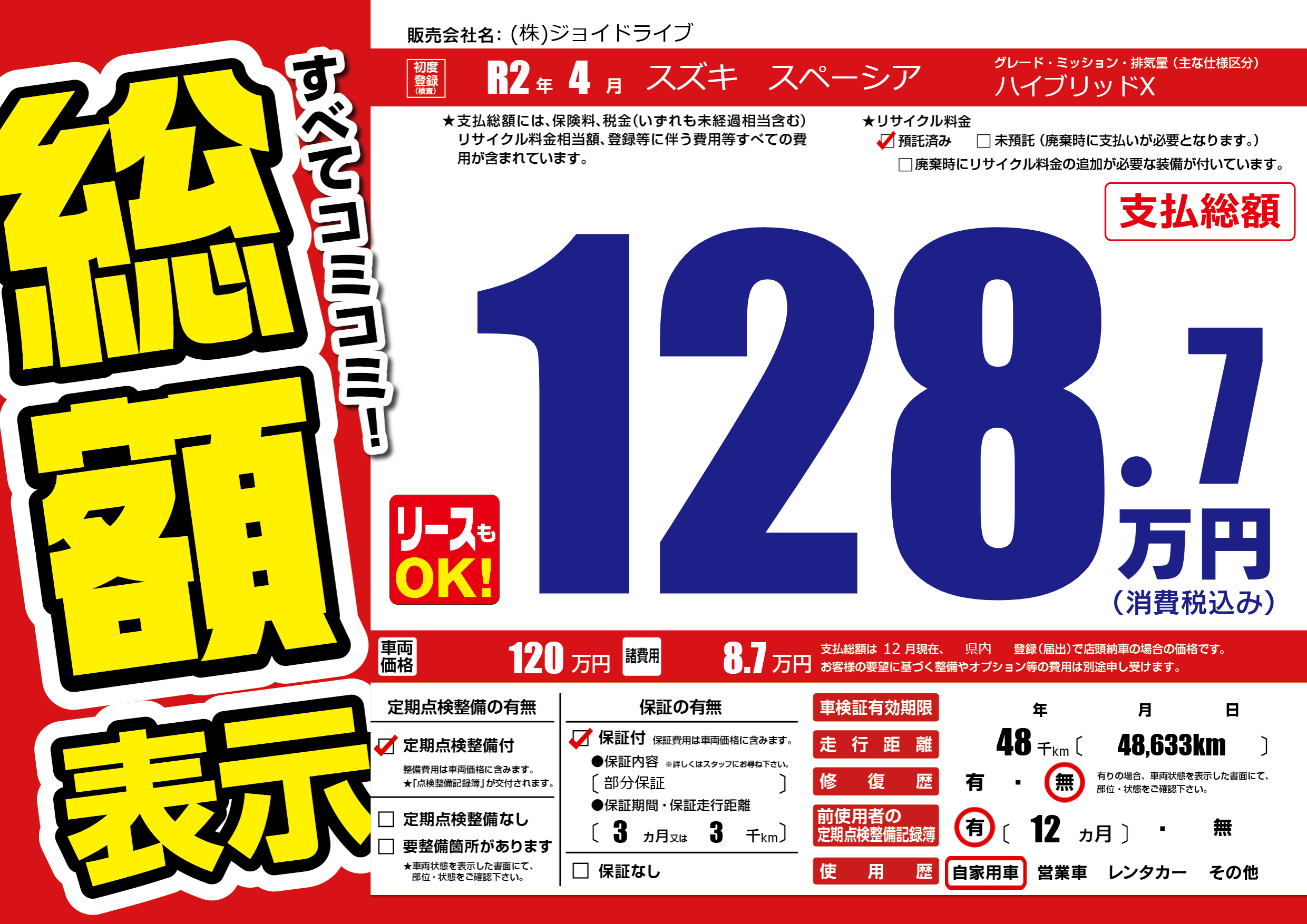 | 走行キロ | 4.8万km | 初年度登録 | R2年4月 |