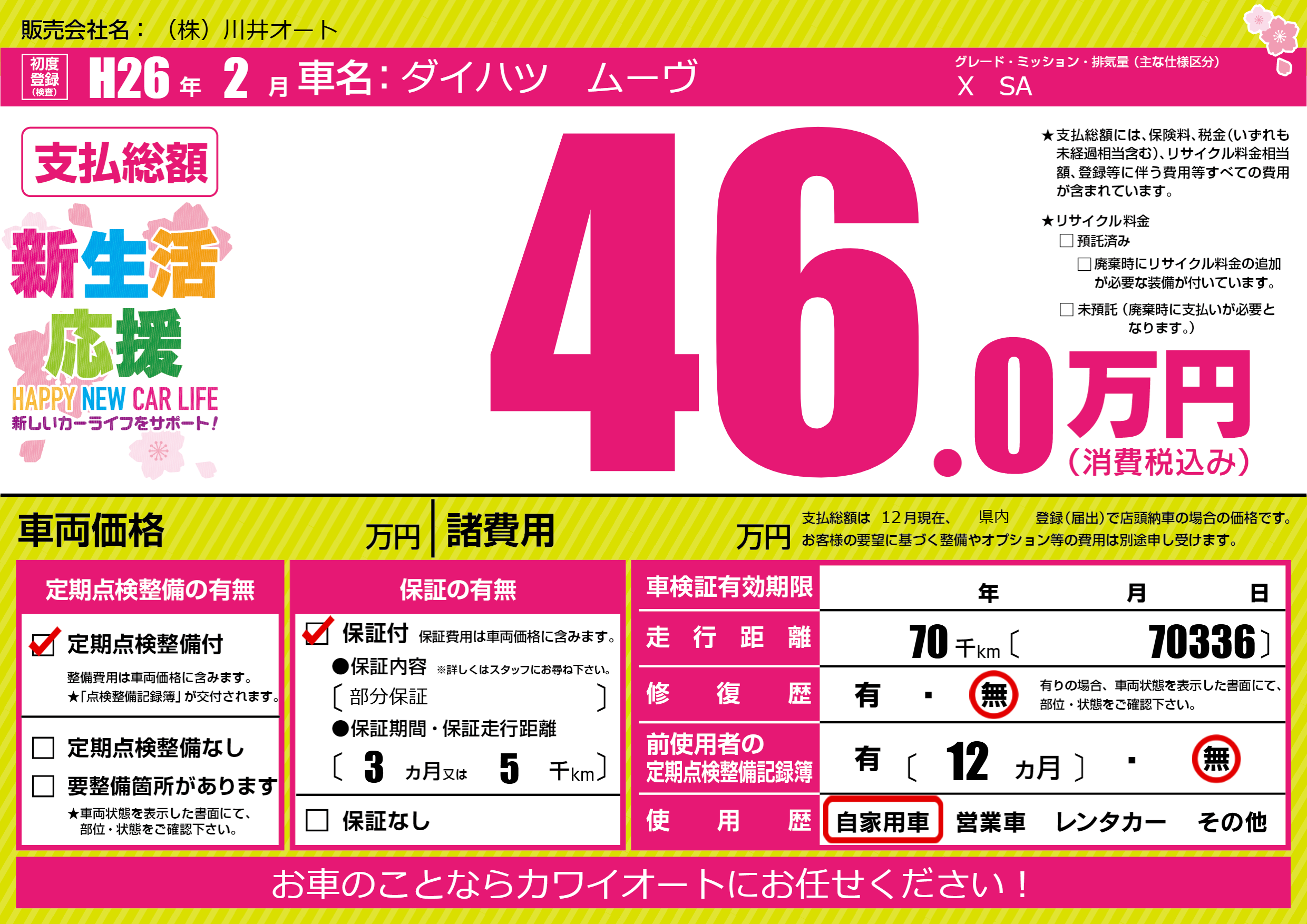| 走行キロ | 7万km | 初年度登録 | H26年2月 |