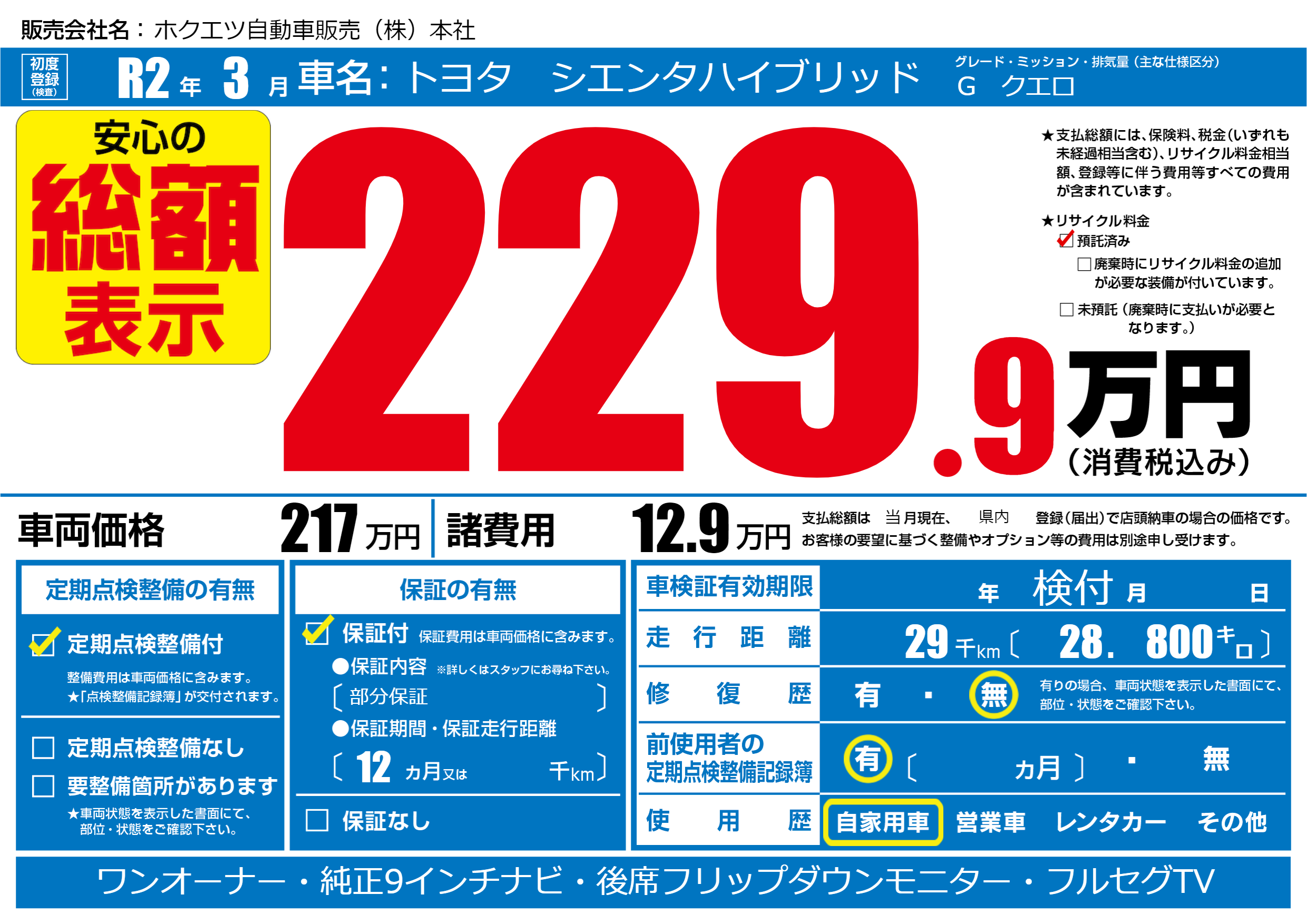 | 車名 | トヨタ シエンタハイブリッド | グレード ミッション 排気量 |