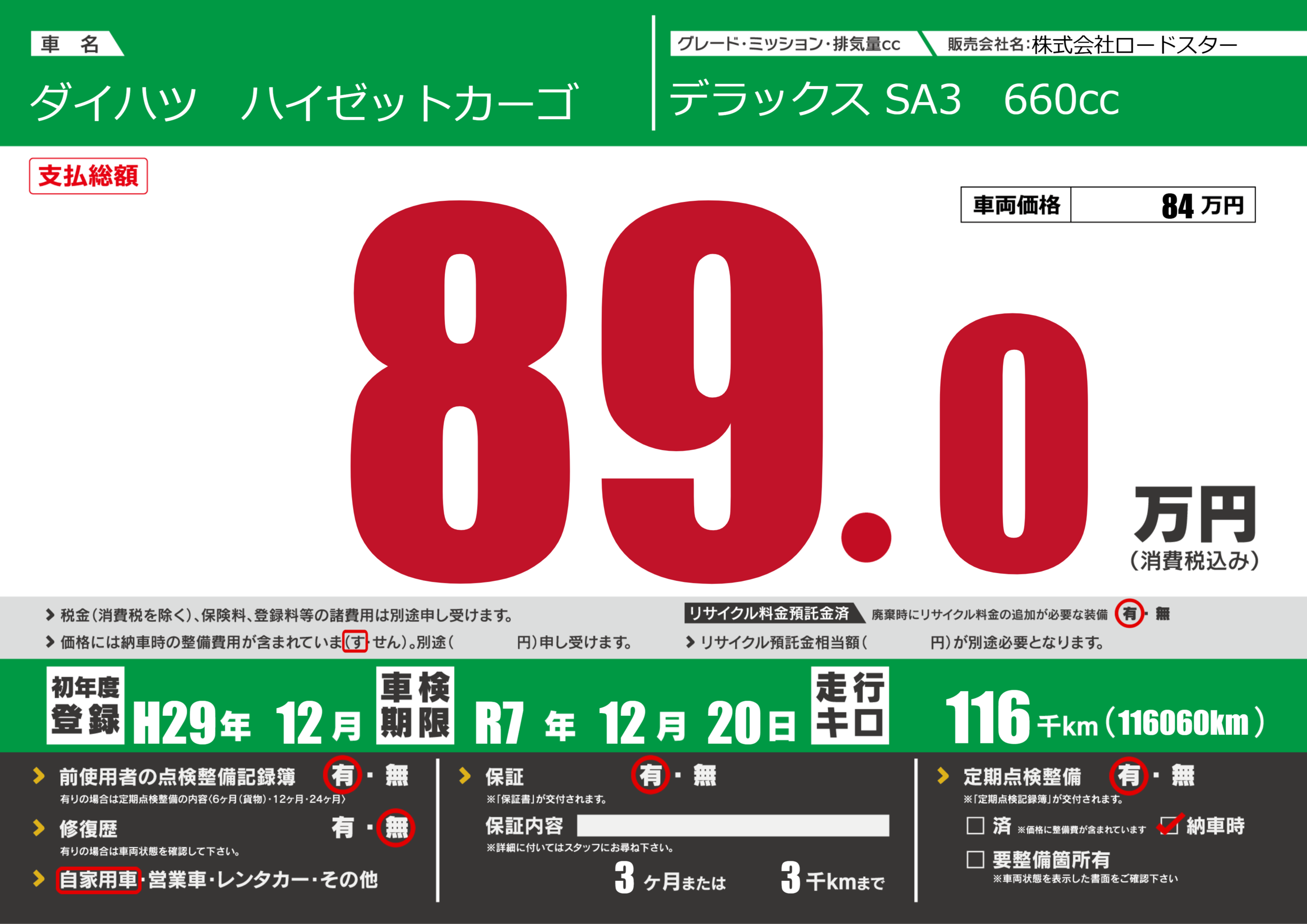 保証付き 保証内容(---) 3ヶ月または(3)千kmまで |