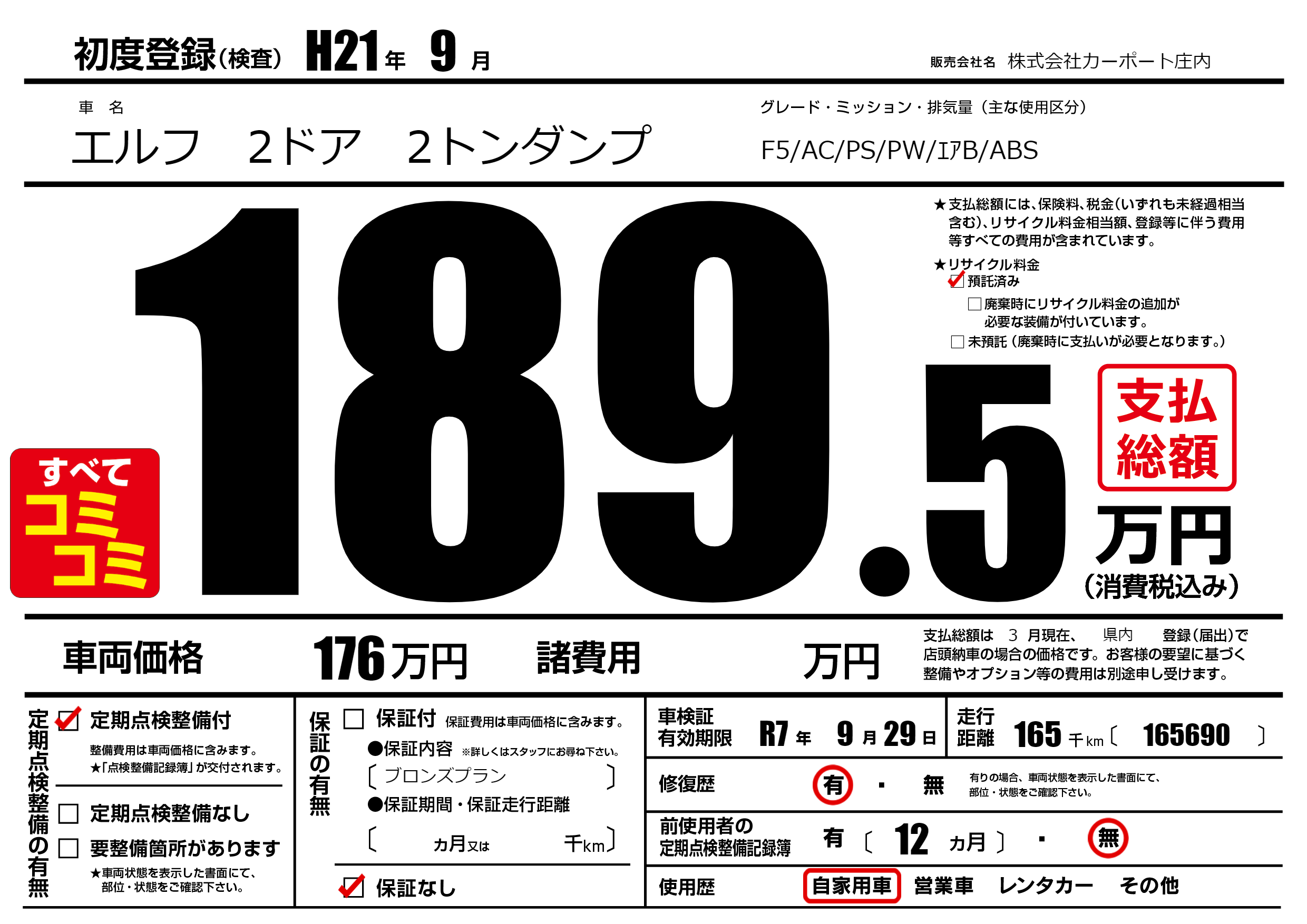 | 走行キロ | 16.5万km | 初年度登録 | H21年9月 |
