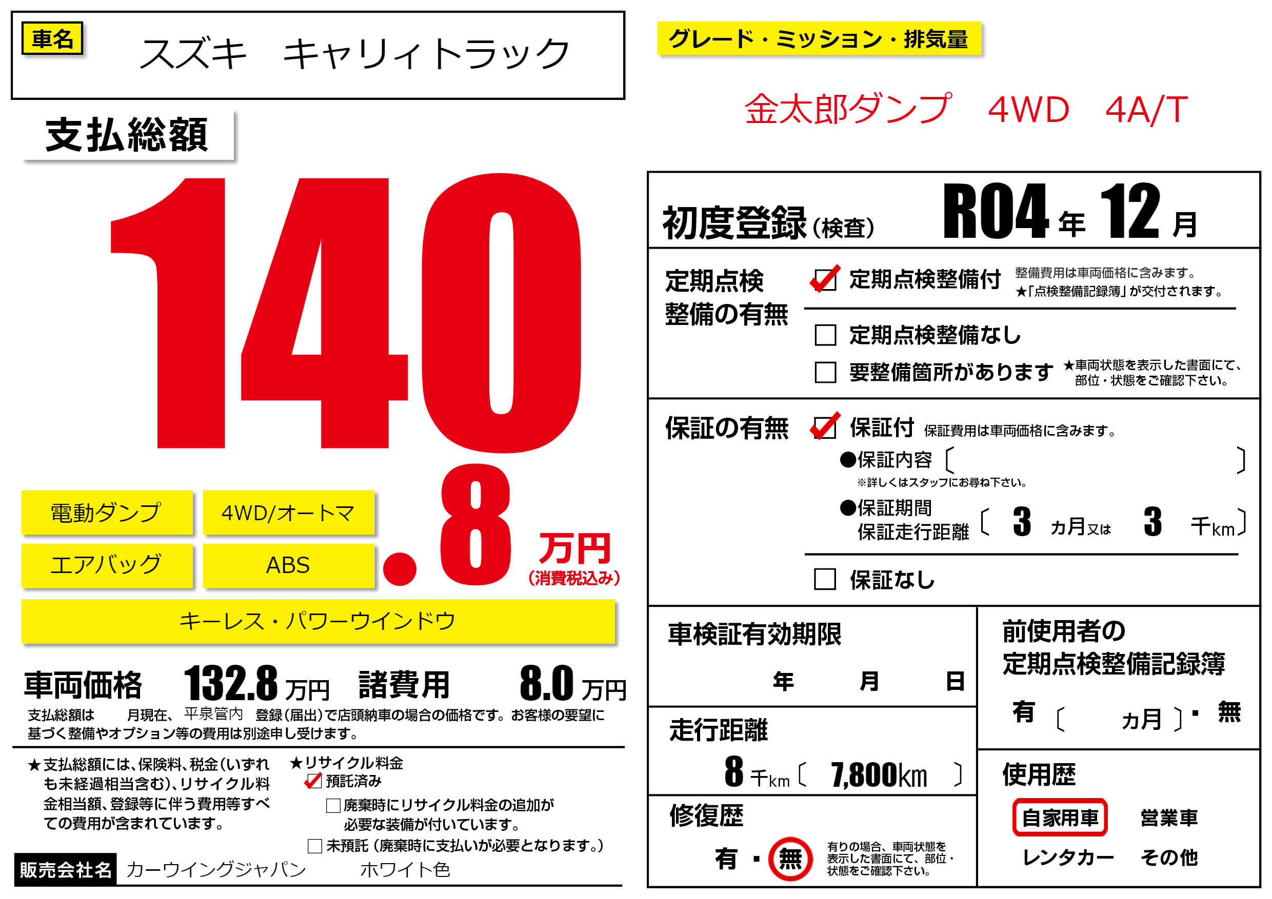 | 走行キロ | 0.8万km | 初年度登録 | R04年12月 |