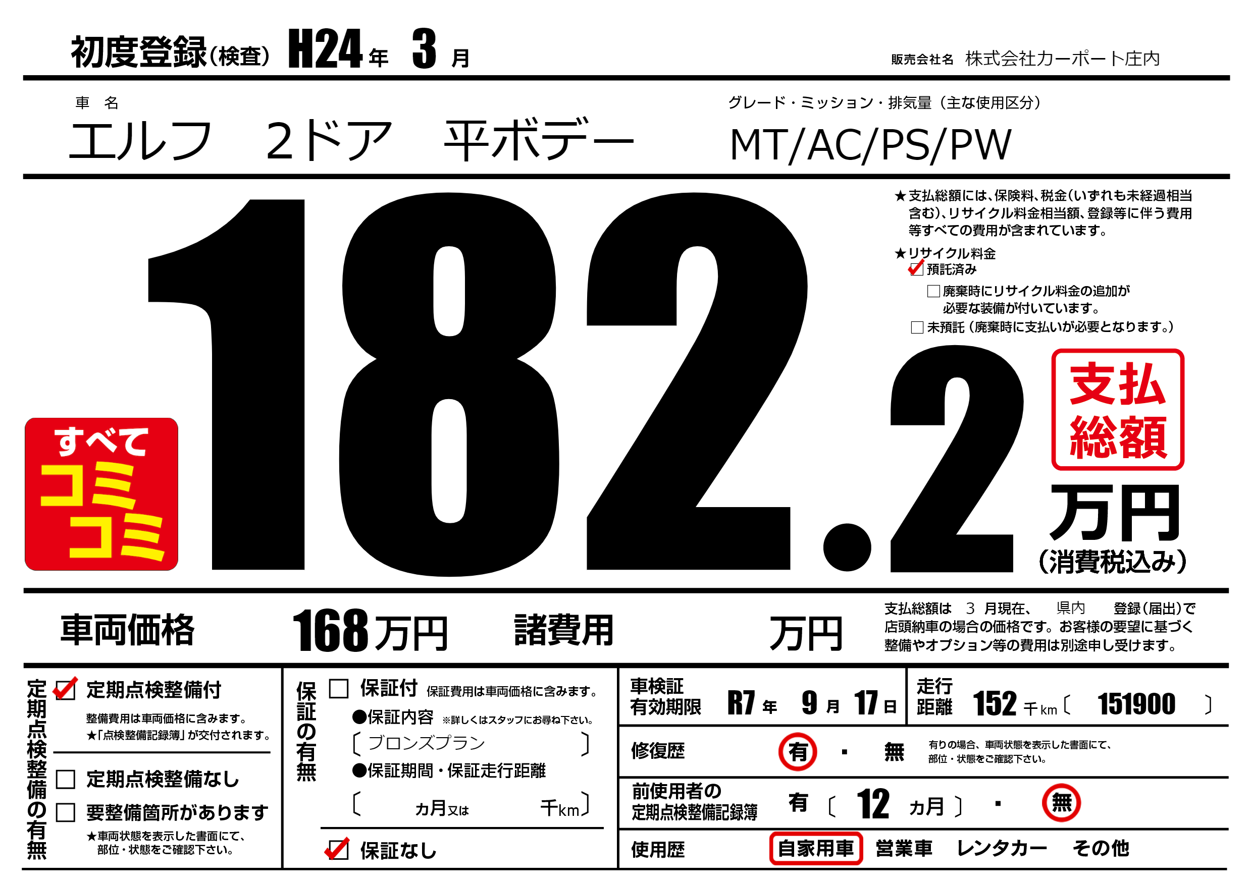 | 走行キロ | 15.2万km | 初年度登録 | H24年3月 |