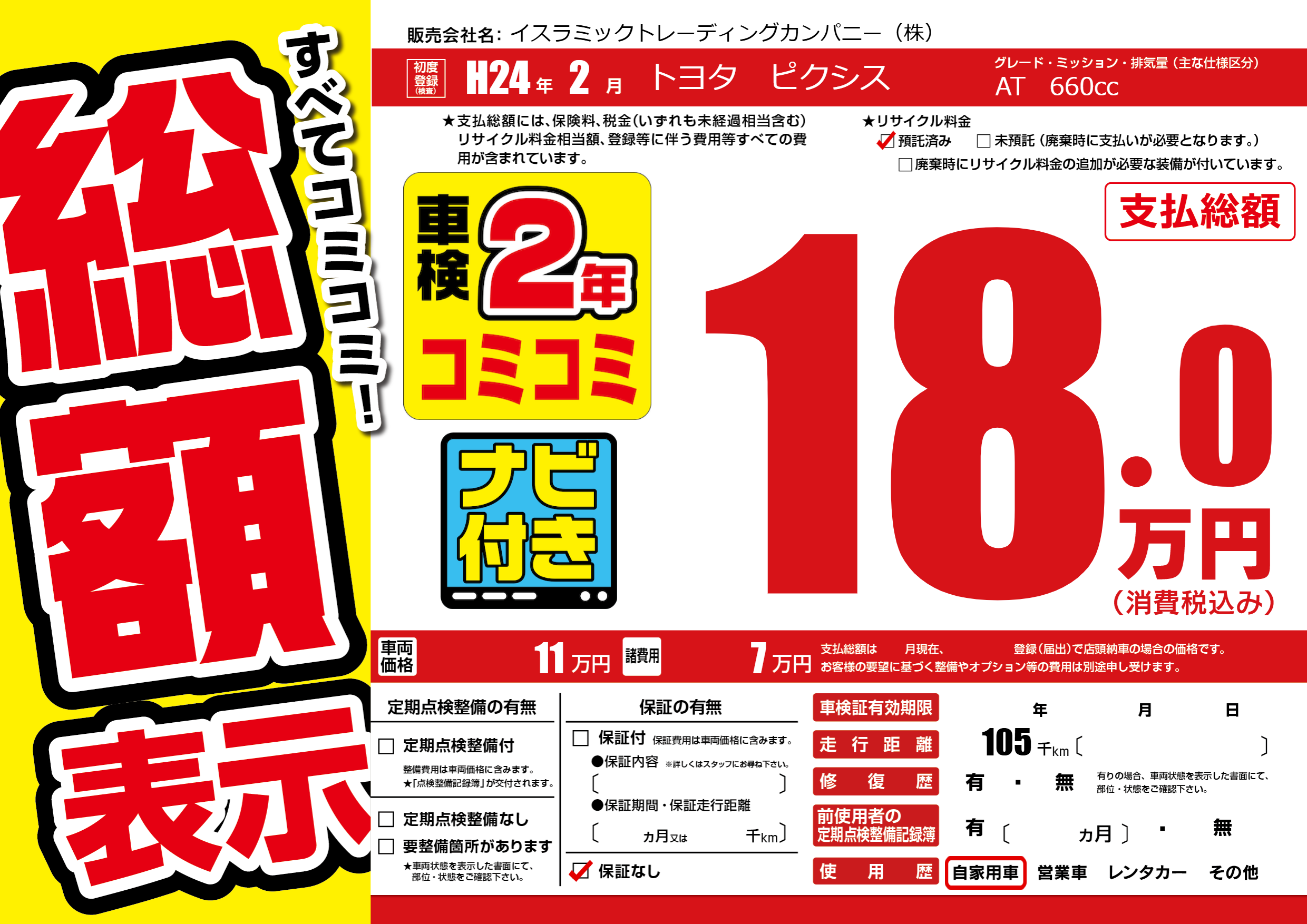 | 車名 | トヨタ ピクシス | グレード ミッション 排気量 |