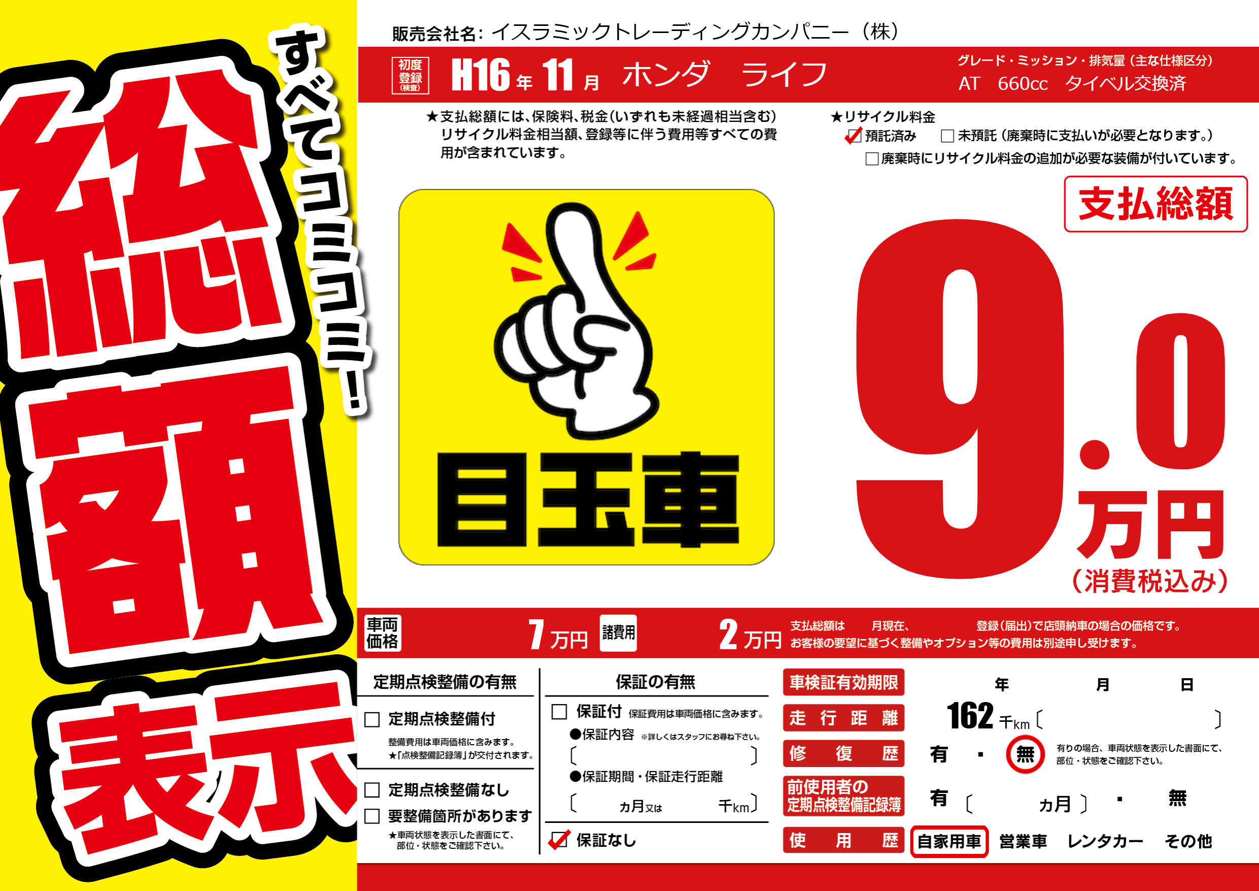 | 車名 | ホンダ ライフ | グレード ミッション 排気量 |